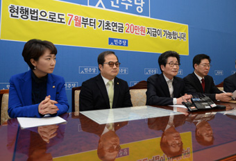 국회 보건복지위원회 소속 민주당 의원들은 26일 정부의 기초노령연금안과 관련, "현행 기초노령연금법으로 당장 내일부터라도 20만원 지급이 가능하다"고 밝혔다. 보건복지위 야당 간사인 이목희 의원 등은 이날 오전 국회에서 기자회견을 갖고 "'2월 국회에서 기초연금법이 통과되지 않으면 7월부터 기초연금을 지급할 수 없다'고 하는 정부와 새누리당의 주장은 국민을 협박해 통과시키고자 하는 거짓말에 불과하다"며 이같이 말했다. 현행 기초노령연금법상 연금액은 가입자 평균소득(약200만원)의 100분의 5(약10만원)에 해당하는 액수로 돼있다. 민주당은 해당 조항의 '100분의 5'를 '100분의 10'으로만 바꾸면 소득 하위 70% 어르신들에게 20만원씩 지급할 수 있다고 밝혔다. 지급 대상도 정해져 있으니 준비 기간도 필요 없다는 것이 민주당의 주장이다. 민주당은 지난 2007년 한나라당과 열린우리당 국민연금개혁 실무협상대표단 간의 합의에서 "기초노령연금의 지급액을 현행 가입자 평균소득의 5%에서 2028년까지 10%로 단계적으로 인상한다"고 한 것도 근거로 제시했다. 이들은 특히 국민연금 가입기간과 연계하는 정부의 기초노령연금안과 관련해 "이는 국민연금에 성실하게 가입해온 사람들이 역으로 손해를 보는 차별적인 기초연금 지급 방안"이라며 강력히 반대했다. 김성주 의원은 이날 "국민들, 특히 성실하게 국민연금을 납부해온 가입자들에게 손해되는 법을 내놓고 받으라고 하면 우리는 반대하는 것이 맞다. 왜냐하면 우리는 국민의 노후를 보장해야 하기 때문"이라고 말했다. 이들은 2007년 국민연금개혁 실무협상 합의문 상에 있는 병급조정 규정 삭제조항을 제시하며 "2007년 기초노령연금법을 개정할 때 여야 합의에서 가장 큰 원칙은 기초노령연금과 국민연금을 연계하지 않는다는 것이었다"고 밝혔다. 병급조정은 수급자가 두 개 이상의 연급 급여를 받을 경우 본인의 선택에 따라 그 중 하나만을 수급하거나 감액하는 규정이다. 이들은 이어 '소득 하위 70% 어르신 모두에게 월 20만원씩 지급하기에는 예산이 모자란다'는 새누리당 주장에 대해 "이미 예산 5조2천억원이 통과됐다. 이것으로 충분하다"고 맞받았다. 민주당은 이날 기자회견에서 "앞으로 계속 새누리당은 기존의 주장을 할 것이기 때문에 국민들이 직접 판단할 수 있도록 해야 한다"며 새누리당에게 TV 공개토론을 제안했다.
