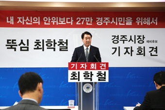 최학철 경주시장 예비후보가 8일 기자회견을 통해 새누리당을 탈당, 무소속으로 출마해 경주시민들의 직접 투표로 심판을 받기로 했다고 밝혔다.