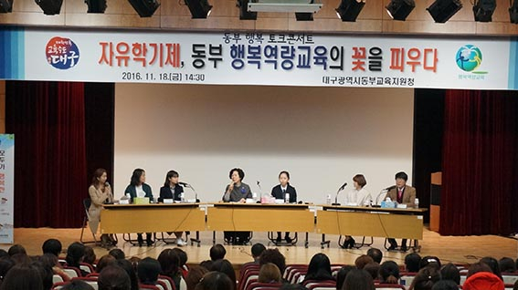 대구동부교육지원청이 지난 18일 오후 2시 30분부터 대구교육연구정보원 시청각실에서 초중학교 교사 및 학부모 350여명이 모인 가운데 '자유학기제와 함께 동부 행복 토크콘서트'를 열었다. 이 토크콘서트는 자유학기제에 대한 올바른 정보제공과 현장과의 소통 강화를 통해 학부모와 긍정적 공감대를 형성하고 제도에 대한 이해를 높여 자유학기제로 인한 학력저하와 사교육 참여에 대한 우려 및 불안감을 해소할 목적으로 진행됐다. 올해 두 번째로 열린 토크콘서트에는 박을규 동부교육지원청교육장을 비롯한 교사, 학부모 2명, 학생 2명 등 6명으로 구성된 패널이 동부교육지원청의 자유학기제 운영의 성과와 대구교육의 발전 방향에 대한 종합적인 토론을 했다.식전 행사로는 매호중 모듬북 공연이 있었다. 본행사는 자유학기제에 관한 중학교 학생들의 다양한 의견을 미리 촬영한 동영상을 시청한 후, 청중과 함께하는 참여형 토크콘서트로 '자유학기제 실시로 학교는 어떻게 변화하고 있는가', '자유학기제의 성과와 동부교육의 발전 방향은 무엇인가'라는 두 가지 주제로 한 시간 동안 진행됐다. 마무리는 청중과 패널간 질의응답으로 이뤄졌다. 동부교육지원청 박을규 교육장은 "동부 행복 토크콘서트가 자유학기제를 통해 학생들이 꿈과 끼를 찾고 자신의 진로를 개척하는데 많은 도움이 됐을 것"이라고 말했다. 류상현 기자