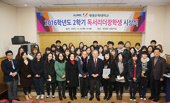 계명문화대가 지난 8일 대학 본관 시청각실에서 '계명문화 독서리더장학생'으로 선발된 학생들에게 시상을 진행했다. 이 대학은 학생들의 교양과 경쟁력을 높이기 위해 지난 2002년부터 15년 동안 이 상을 주어왔다. 장학생 선발은 2016학년도 2학기 동안 도서대출권 수, 서평작성, 전자도서관 이용 실적, 독서토론클럽 참여, 희망도서 신청, UCC 등을 평가해 우수 이용자 52명을 선발, 상장과 함께 총 300만원의 장학금을 지급했다. 이 가운데 경찰행정과 김지연(18 ·학년) 학생은 무려 295권의 도서대출실적과 독서후기공모, e러닝, UCC 등에서 우수성을 인정받아 장학금 20만원과 최우수상 수상자로 선정됐다. 박명호 총장은 시상식에서 "책 안에는 지식을 가진 사람의 경험이 녹아 있는 지혜가 담겨져 있다"며 "책을 통해 더 넓은 세상과 소통하고 지혜을 키워 세상에 선한 영향력을 끼치는 리더가 되어 주기를 기대한다"고 말했다 류상현 기자