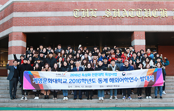 계명문화대가 겨울방학을 맞아 99명의 재학생을 선발, 지난 달 30일 동계해외어학연수 발대식을 가졌다. 이번에 선발된 학생들 중 25명은 지난 달 31일~오는 28일 필리핀 웨스트네그로스대학에서, 64명은 필리핀 혹슨대학교에서 8일~2월 4일 각각 원어민 1:1 수업 80시간, 원어민 1:4 그룹수업 40시간, 토익, 오픽 등 특화 수업 40시간 등 160시간의 외국어 집중교육을 받게 된다. 또 싱가포르 MDIS대학에서 공부할 10명의 학생은 6일~2월 3일 전체 그룹수업(Life Science, IT 워크샵 등) 등 93시간의 교육을 받을 예정이다. 학생들은 지난 봄 학기때 부터 교내어학교육을 통해 집중교육을 받으며, 교내모의어학시험 및 영어 면접 등을 거쳐 선발됐다. 박명호 총장은 "글로컬 문화리더 양성이라는 학교 비전에 맞춰 현지학기제, 글로벌현장학습, 해외취업지원사업 등의 다양한 프로그램 운영을 통해 글로벌 인재를 양성하고, 앞으로 이를 더욱 더 강화하기 위해 지원의 폭도 넓혀갈 계획"이라고 밝혔다. 계명문화대는 이번 동계연수에 학생들의 부담을 줄이고 글로벌 역량 향상에만 집중할 수 있도록 해외연수비용 및 체제비 전액과 항공운임의 일부를 지원했다. 한편, 계명문화대는 하계 해외어학연수 4개국(영국, 일본, 중국, 필리핀)에 56명을 포함해 2016학년도에 총 155명을 파견했다. 류상현 기자