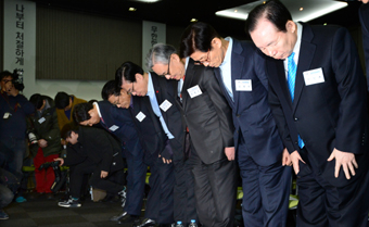 인명진 새누리당 비상대책위원장과 정우택 원내대표 등 새누리당 의원 및 당직자들이 11일 오저 경기 일산 킨텍스에서 열린 '반성 다짐 화합을 위한 대토론회'에서 최근 분당 사태와 당 개혁 과정에서의 잡음과 관련해 국민들을 향해 고개 숙여 사과 하고 있다.