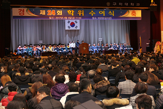 구미대학교(총장 정창주) 제24회 학위수여식이 지난 3일 대학 긍지관 강당에서 열렸다. 졸업식에는 주은영 재단이사장, 정창주 총장을 비롯 김익수 경상북도 시군의회 의장협의회장 등 각계 인사 30여 명과 졸업생 및 학부모 등 약 1천600여 명이 참석했다. 올해에는 1천963명의 전문학사학위와 전공심화과정으로 248명이 4년제 학사학위를 받아 모두 2211명이 학사모를 썼다. 제16기 창조농업인양성과정 수료생 14명도 배출됐다. 이날 졸업식에서 구미대 GET(Global Elite Training) 학생들이 후배들을 위한 대학발전기금으로 500만원을 전달해 훈훈한 화제가 됐다. 구미대가 2014년부터 글로벌 인재 양성 프로그램으로 시행한 GET 프로그램은 수능 4등급 이내의 학생들을 우선 대상으로 심사과정을 통해 매년 30~50명을 선발한다. 이들에게는 매학기 100만원의 장학금과 노트북(PC) 지급, 토익(TOEIC) 특강, 해외연수와 근로장학생 우선 배정 등 다양한 혜택이 주어지며 학업성적 부진 시에는 탈락되기도 한다. 이번 대학발전기금 전달은 지난해 1기 졸업생들의 기금 전달에 이은 것으로 모교와 후배사랑의 의미를 더하고 있다. 모범적인 GET 활동과 우수한 학업성적으로 이날 도지사상을 수상한 조승현(컴퓨터전자과·23) 씨는 지난 가을 SK하이닉스 취업에도 성공했다. 그는 "GET를 통해 장학금과 해외연수 등 대학생활에서 많은 혜택을 받은 그 고마움을 선배들처럼 후배들과 나누고 싶었다"고 말했다. 이날 2기 GET 졸업생은 군 복무, 3학년 진학 등을 제외한 9명이다 정창주 총장은 졸업식에서 "여러분은 이제 무한한 경쟁과 과제에 직면하겠지만 끊임없는 노력과 도전 정신을 이어간다면 훌륭한 사회인으로서 성공할 수 있을 것"이라며 졸업생들을 격려했다. 류희철 기자