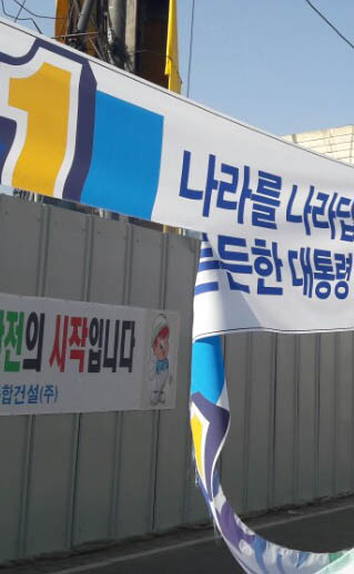 19일 오전 대전 중구의 한 도로에 설치된 더불어민주당 문재인 대선후보의 현수막이 훼손되어 있다.   사진제공=대전지방경찰청
