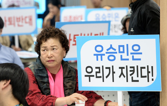 유승민 바른정당 대선후보 지지자들이 24일 오후 서울 여의도 바른정당 당사에서 '사퇴 반대'와 '의총 반대'를 주장하고 있다. 바른정당은 이날 오후 7시부터 국회의원회관에서 의총을 열고 유 후보 사퇴 및 후보단일화 여부와 향후 선거운동 전략 등을 놓고 토론을 벌일 계획이다.