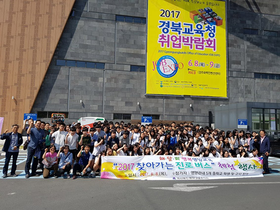 영양교육지원청(교육장 박상호)은 지난 8일 경주 화백컨벤션센터에서 '2017 찾아가는 진로 버스 체험 행사'를 운영했다. 이번 찾아가는 진로 버스 체험 행사는 영양 관내 중학교 학생 143명, 인솔교사 22명 등 총 165명이 참여했다. 이번 캠프는 경상북도교육청이 주관하는 '2017 취업박람회' 행사에 영양 지역 학생들이 참가하여 올바른 진로탐색 기회를 제공하여 스스로 진로를 설계하여 준비할 수 있는 시간이 마련됐다. 특히 미국 투산시 셰퍼드중학교 학생 4명과 인솔교사 3명도 참가하여 영양 지역 학생들의 진로 체험 과정부터 목표를 세우고 실천할 수 있는 과정까지 함께 하면서 영양 지역 학생들의 진로 체험 행사에 깊은 관심을 나타냈다. 박상호 교육장은 "캠프를 통해 학생들이 자신의 꿈과 끼를 찾고 더 멋진 인생을 설계하는 계기가 되기를 바란다"고 말했다. 김학봉 기자