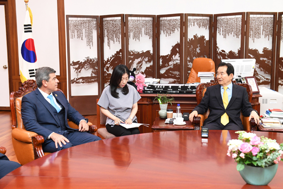 정세균 국회의장이 22일 오전 의장 집무실에서 발따사르 마르띠네스 몬떼마요르(Baltazar Martinez Montemayor) 멕시코 연방하원 인프라상임위 부위원장의 예방을 받았다. 정 의장은 "멕시코에 기아자동차를 비롯해 많은 한국 기업들이 진출하고 투자하고 있다"면서 한국 기업들의 원활한 투자와 활발한 활동을 위한 멕시코 정부 및 의회의 지원과 관심을 당부했다. 또"올해 터키에서 개최되는 MIKTA 국제회의에서 멕시코 상원의장을 꼭 만나길 바란다"고 전했다. 이 날 접견에는 한국-멕시코 의원친선협회 회장인 김상희의원과 이사인 이원욱의원 등이 함께 했다. 이인수 기자
