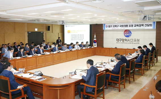 대구시교육청이 19일 오전 10시 30분 시교육청 여민실에서 대구 지역구 국회의원을 초청해 교육정책에 대한 간담회를 가졌다. 우동기 교육감을 비롯한 교육청 간부, 대구 지역구 국회의원, 시의회 의장과 교육위원이 참석한 간담회에서 올해 대구교육의 방향과 주요업무에 대한 설명과 새로운 정부에 제안하는 교육정책, 대현안 사항에 대해 안내하고 대구교육이 앞서 나아가기 위한 방안에 대한 논의가 이어졌다. 우선 대구교육의 방향과 주요업무에 대해 대구행복역량교육의 배경과 방향, 추진체계에 대해 소개했다. 이에 따른 주요 성과로 ▲서울대학교와 세이브더칠드런의 '한국 아동 삶의 질 연구' ▲서울대학교와 굿네이버스의 '아동권리 실태조사' ▲통계청의 '학교생활 만족도 조사' 등에서 대구가 최상위의 결과를 보였다고 강조했다. 이외 학업중단율, 정서행동 특성검사 관심군 비율, 인터넷·스마트폰 과다 사용자 비율, 학교폭력 피해응답률, 학생건강체력평가 저체력 비율, 대입 수능과 성취도평가 결과, 특성화고 취업률 등에서 전국 최고 수준으로 나타나고 있다고 제시했다. 이어 올해 대구교육의 정책을 '몸과 마음의 바른 성장을 위한 행복역량 함양, 즐거운 수업 몰입을 위한 행복역량교육 지원, 튼튼한 교육디딤돌을 위한 행복환경 조성, 교육공동체 모두가 행복한 교육문화 형성' 등 4가지로 나눠 설명했다. 이외 대구교육청은 정부에 제안한 과제로, ▲자사고·외고·국제고 문제 교육청에 권한 부여 ▲응보적 생활교육에서 교우관계 회복적 생활교육 전환 ▲국가표준교육과정 지방 이양으로 교육자치 실현 ▲초·중등 학교와 지역교육청의 자율성 대폭 확대 ▲창의력과 컴퓨팅 사고력을 키워주는 방향으로 국가교육과정 방향 전환 ▲미래 인재 양성을 위한 교원 양성과 임용체제 개편 ▲다양한 대안교육 기관과 시설 지원 확대 ▲제1외국어 다양화 등 교육발전 정책 9가지를 소개했다. 또 현안 사항으로는 ▲교육국제화 특구 대구 전역 확대 ▲대안교육 특성화중학교 지정 ▲사립학교 이전부지 지원 관련 사립학교법 개정 ▲영재학교인 대구과학고등학교 운영비 지원 ▲시·도교육청의 실·국 설치 기준 개선 ▲대구국제고등학교 설립 추진에 대해 안내했다. 우동기 교육감은 "대구교육이 교육도시로서의 명성을 다시 되찾게 되었고 대한민국 교육수도로서 우리나라 교육을 선도하고 있지만, 급변하는 사회에 미리 대처해야 하며 이를 위해 대구미래교육정책기획단을 구성해 새로운 시대의 새로운 교육을 만들기 위해 노력하고 있다"며 "국회의원들도 지역 교육의 중요성을 유념하고 관심을 가져 줄 것"을 요청했다.