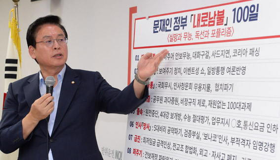 야3당은 문재인 정부 100일을 하루 앞둔 16일 '내로남불', '실패', '무능', '포퓰리즘' 등으로 규정하며 혹평을 쏟아냈다. 정우택 자유한국당 원내대표는 이날 국회에서 기자간담회를 갖고 "촛불 덕분에 어부지리 격으로 정권을 잡았더라도 집권한 이상 진정으로 모든 국민을 위한 정부가 되고 국민을 통합하려는 노력을 진정성 있게 해야 한다"며 "취임 100일이 되기까지 아직도 촛불 의식을 벗어나지 못하고 있다. 아직도 촛불에 취해 있다고 과언이 아니다"라고 밝혔다. 정 원내대표는 "문재인 정부 100일은 한마디로 '내로남불' 100일"이라며 "더 구체적으로 말하면 실망과 무능, 독선과 포퓰리즘의 100일"이라고 주장했다. 김동철 국민의당 원내대표는 "지금까지 문재인 정부가 보여주는 여러 행태들은 문재인 정부가 성공의 길로 가고 있다는 확신을 가질 수가 없다"며 인사와 정책 모두 문제가 있다고 지적했다. 김 원내대표는 "문재인 정부 인사는 박근혜 정부의 실패한 인사에서 기인한 촛불혁명으로 탄생한 정권이기 때문에 누구보다 도덕적으로 깨끗한 인사가 강조됐음에도 이명박근혜 정권과 같은 원칙을 위배한 인사들을 고집했다"며 "문재인 정부 인사는 단적으로 말하면 코드인사·보은인사"라고 강조했다. 이혜훈 바른정당 대표도 "안보는 무능, 복지는 포퓰리즘"이라며 문재인 정부의 외교안보, 복지, 세제개편안, 인사와 관련해 혹평을 내놨다. 이 대표는 안보에 대해서는 "지금은 대화에 매달릴 때가 아니고 제재와 대화를 고강도로 높여야 할 상황인데 대통령은 어제 광복절 경축사에서도 방점은 대화에 두고, 제재는 마지못해 하는 피동적인 정도로 언급했다"며 "대통령이 북핵을 기정사실화하는 방향으로 나가고 있어 유감"이라고 밝혔다.