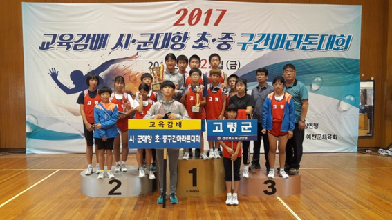 고령교육지원청(교육장 김형수)은 지난 22일 예천에서 실시한 2017 교육감배 시·군대항 초·중 구간마라톤 대회에서 초등부 우승(군부), 중등부 4위(군부)를 하여 종합 준우승을 하는 쾌거를 이루었다. 구간마라톤에 참가한 육상부 선수들은 본 대회를 준비하기 위하여 여름방학때부터 아침훈련, 오후훈련 뿐만 아니라 속리산 전지 훈련을 하면서 꾸준히 대회를 준비했다. 지난 9월 9일에는 미리 코스를 탐색하였으며, 매일 스피드 훈련, 지구력 훈련, 이미지 트레이닝을 했다. 육상부 선수들은 많은 훈련을 해왔기 대회에 들어가기 전부터 자신감에 차 있었다. 대회가 시작되면서 첫 주자부터 선두권을 빼앗기지 않고 끝까지 유지하여 초등부는 우승, 중등부는 4위를 하고, 종합 준우승을 차지했다. 그 동안 육상에서 뚜렷한 성적이 없었지만 천순선 코치의 치밀한 분석 및 과학적 체력 훈련 등 체계적인 훈련을 통하여 선수들의 기량이 나날이 발전한 것이다. 구간 마라톤 대회에 참가한 차민수 학생은 "우리가 흘린 땀은 우리를 배신하지 않습니다. 그 동안 힘들고 어려운 때도 있었지만 포기하지 않고 각자가 맡은 구간을 최선을 다해 뛰었기 때문에 이러한 성적을 거둘 수 있었다고 생각합니다"라고 소감을 말했다. 김형수 교육장은 "이번 대회를 계기로 학생들에게 하면 된다는 자신감과 선수 개개인의 자존감을 향상시킬 수 있었다. 선수들뿐만 아니라 일반 학생들도 기초체력을 튼튼히 하여 고령 육상을 한 단계 올리자"라고 격려했다.