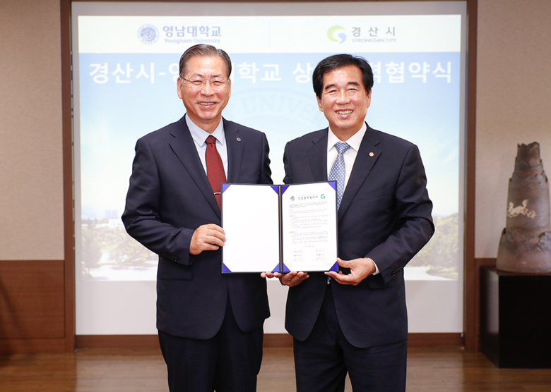 영남대학교가 경산시와 손을 잡고 지역사회 발전과 혁신에 앞장선다. 영남대와 경산시는 지난 25일 지역 사회 발전을 위해 양 기관의 역량을 모으기로 하는 업무 협약을 체결했다. 이날 양 기관은 ▲마을공동체, 도시재생 및 사회적 경제 실현을 위한 사회맞춤형 협력체계 구축 ▲인적 및 물적 교류를 통한 지역사회협력사업 추진 ▲현장학습에 도움이 될 수 있는 학생 인턴십 프로그램의 개발 ▲지역사회혁신 교과목 개설을 통한 지역인재의 육성 및 지역사회 관련 일자리 창출 ▲지역사회 상호발전을 위한 협력 네트워크 구축 등을 위해 협력하기로 합의했다. 이번 협약 체결에 따라 영남대 LINC+사업단에서는 경산시와 함께 마을꾸미기, 도시재생, 지역유산 창출, 문화관광콘텐츠 개발 등의 사업을 공동으로 수행하고, 지역주민 밀착형 프로그램을 개발 및 운영할 방침이다. 또 양 기관은 지역전문가 육성을 통한 지역문화 활성화에도 힘을 모으기로 약속했다. 서길수 영남대 총장은 "이번 협약 체결에 따라 영남대가 지역발전에 힘을 보탤 수 있는 토대를 마련했다"면서 "지역을 대표하는 대학으로서 경산시뿐만 아니라, 산업체를 비롯한 지역의 여러 기관들과 힘을 모아 지역발전과 지역민의 삶의 질 향상을 위해 앞장서겠다"고 말했다. 안대식 기자