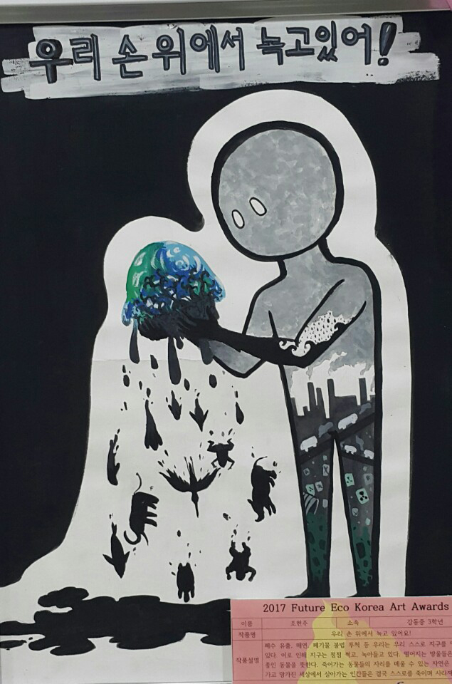 대구강동중학교가 국내 최고의 청소년 환경예술대전인 '2017 대한민국미래환경 예술공모대전'에서 우수한 성적을 거뒀다. 강동중학교 박옥봉 교사는 지도교사상을 조하빈·조현주 학생은 각각 최우수상, 김사랑은 심사위원상을 받았다. 아동·청소년·청년을 대상으로 환경오염 문제의 심각성과 우리가 추구해야 할 환경의 가치를 예술적으로 표현한 것이 대회의 심사기준이다. 환경문제에 대한 심각성과 환경 친화적 내용을 표현한 작품, 환경 보호라는 과제를 창의적 아이디어로 표현한 작품을 뽑는데 강동중학교 학생이 우수한 성적을 거뒀다. 박옥봉 지도교사는 "이런 공모 대전을 계기로 우리가 잊고 지냈던 지구 환경에 대한 관심과 세계인이 보다 안전한 환경에서 숨 쉬고 생활할 수 있는 더불어 살아가는 환경 조성을 위해 어떻게 노력해야 하는가를 학생들에게 생각하고 실천해야 할지를 조금이라도 심어주고 싶은 마음에 이 공모대전에 응하게 됐다"고 했다. 또 최우수상을 받은 조현주 학생은 "작품을 통해 호소하고 있는 환경오염, 환경파괴에 대한 고통과 심각성, 의미성이 잘 전달되기를 바란다"며 "밝고 푸른 미래를 맞이하기 위한 우리 모두의 노력이 필요한 것 같다"고 소감을 전했다.