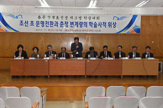 대구한의대학교 CORE사업단은 지난 8일 바이오센터 세미나실에서 '조선 초 문명전환과 춘정 변계량의 학술사적 위상'이라는 주제로 학술대회를 개최했다. 이번 학술대회는 조선 최초의 문형이자 확고한 학술사적 위상을 가지고 있는 변계량 선생의 유업과 시대정신을 공유해 우리 삶의 성찰에 한 걸음 더 다가가는 기회로 삼기위해 실시하게 됐다. 대구한의대학교와 밀양시가 주최하고 대구한의대 CORE사업단과 국학연구원, 부산대 점필재연구소가 주관한 이번 학술대회에는 국내·외 인문학 관련 전문가와 교수, 학생 등 200여명이 참석한 가운데, 변창훈 총장의 개회사, 박일호 밀양시장의 대회사, 대구한의대 변정환 명예총장의 환영사 순으로 진행됐다. 조선 전기 통유의 모델, 춘정 변계량 이라는 주제로 한국학중앙연구원 박병력 교수의 기조발표를 시작으로 ▲부산대 정출헌 교수의 춘정 변계량의 문명의식과 시대정신 ▲대구한의대 천인석 교수의 춘정 변계량의 사상적 특성 ▲서울대 이종묵 교수의 춘정 변계량의 인재 양성 정책 ▲이화여자대 이은영 교수의 춘정 변계량의 표전 제작과 대외관계 ▲부산대 김남이 교수의 춘정 변계량의 시대와 문학 등의 순으로 발표했다. 이어진 종합 토론에서는 발표자와 함께 경북대 이구의 교수, 부산대 신상필 교수, 대구한의대 김성우 교수가 참여해 춘정 변계량 선생의 학문에 대해 토론했다. 강을호 기자