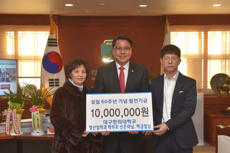 대구한의대학교는 설립 60주년 사업을 통한 제2 창학을 목표로 추진 중인 발전기금 모금에 지역 기업 및 학부모들도 잇따라 기부릴레이에 동참하고 있다. 변창훈 총장은 12일 총장실에서 대학 발전과 향산업학과 학생들의 학업 증진을 위해 발전기금 1,000만원을 기부한 향산업학과 학부모님과 발전기금 전달식을 가졌다. 서울에서 발전기금 전달을 위해 직접 대학을 방문한 박금일씨는 "향산업학과에 재학중인 아들이 학과 공부와 기숙사 생활에 만족하고, 특히 성적우수장학금, 건강장학금, 취업지원장학금, 학과사랑장학금 등 다양한 장학금을 받는 것을 보고 대구한의대의 인재 양성을 위한 장학의지에 감동을 받아 기부를 결심하게 됐다"고 말했다. 향산업학과 박찬익 교수도 학부모님의 소중한 뜻을 받들어 500만원을 학과 발전기금으로 기부했으며, 지난 11월 8일에는 천연화장품을 생산해 해외시장 개척을 위해 노력하고 있는 ㈜바그담도 대학 발전을 위해 500만원을 기부했다. 강을호 기자