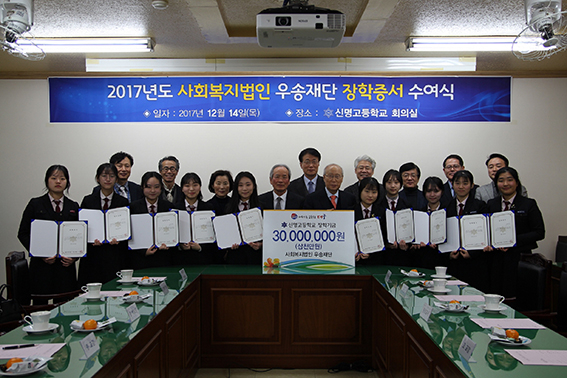 대구신명고등학교가 지난 14일 신명고등학교 회의실에서 2017년 사회복지법인 우송재단 장학증서 수여식을 가졌다. 우송재단은 2014년 9월부터 가정 형편이 어려우나 학교생활을 모범적으로 잘 하고 있는 신명고 학생들에게 꿈과 희망을 심어 주기 위해 3년간 30명의 학생들에게 9000만원의 장학금을 지급했다. 올해도 1·2학년 각 5명씩 총 10명의 학생들에게 개인 당 300만원씩 총 3000만원의 장학금을 지급했다. 김대곤 우송재단 이사장은 "신명은 100년이 넘는 오랜 세월 동안 인재 양성을 위해 노력해온 훌륭한 사학 재단임에 장학금 지원을 결심하게 됐다"며 "장학금을 받은 학생들은 자부심을 가지고 앞으로 더욱 열심히 학교생활에 임해주길 바란다"고 말했다. 한주희 학생(장학금 수혜자, 1학년)은 "어려운 환경에서 공부하는 것에 힘이 들 때도 있지만 장학금을 통해 사랑을 받은 것 같아 기쁘다. 사랑을 받은 것에서 그치지 않고 나누어 주는 사람이 되겠다"고 말했다. 신명고 장용원 교장은 "장학생으로 선발된 학생들이 훗날 남을 위해 도움을 주고 사랑을 베푸는 자랑스러운 신명인이 되길 바란다. 또 신명의 발전에 도움을 주신 우송재단에 감사의 말씀을 전한다"고 말했다. 김범수 기자
