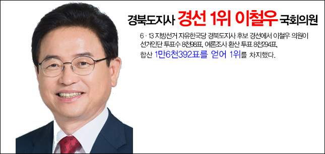 6·13 지방선거 자유한국당 경북도지사 후보 경선에서 이철우 의원이 선거인단 투표수 8천98표, 여론조사 환산 투표 8천294표, 합산 1만6천392표를 얻어 1위를 차지했다. 2위 김광림은 15028표, 3위 박명재 13385표, 4위 남유진 5537표로 나타났다. 4명의 후보가 경쟁한 경북도지사 경우 책임당원 5만4천288명 가운데 2만5천180명(투표율 46.38%)이 투표에 참가한 것으로 집계됐다. 앞서 공관위는 지난 5일 책임당원 모바일 투표, 7∼8일 일반국민 3천명 대상 여론조사, 8일 책임당원 현장투표 절차를 거쳤다. 하지만 남유진 후보가 불공정 경선이라며 이의를 제기해 일단 후보 확정을 하지 않고 이날 오후7시로 예정된 중앙당 공관위 긴급회의를 거쳐 후보를 최종 확정키로 했다. 경선에 승리한 이 후보는 "이제 경선은 끝났다. 모두가 하나로 힘을 모아 경선에서 보여준 열정을 6.13 지방선거에서 압승으로 보답 하겠다“면서 "경선과정에서 보내준 도민과 당원들의 성원을 잊지 않겠다”고 다짐했다. 서인교 기자