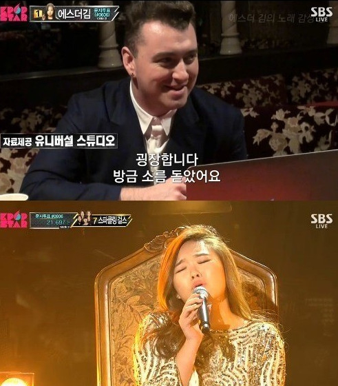 유명 팝가수 샘스미스가 온라인상 화제를 모으고 있는 가운데 그가 한국 오디션 프로그램을 보고 감탄한 사실이 알려져 새삼 관심을 끌고 있다.샘스미스는 앞서 SBS '일요일이 좋다-서바이벌 오디션 K팝스타4'에 출연해 도전자들의 노래를 듣고 놀랍다는 반응을 보였다.당시 방송에서 에스더김은 샘스미스의 ‘Lay me down’을 선곡해 자신만의 색으로 표현해 뜨거운 박수를 받았다.특히 무대에 앞서 에스더김은 “(샘스미스는) 내가 정말 좋아하는 가수다. 첫 번째 무대는 내가 가장 좋아하는 가수의 좋아하는 노래를 부르고 싶었다”고 선곡 이유를 밝혔다.이에 ‘K팝스타4’ 측은 샘스미스에게 에스더 김의 영상을 보여주고 그의 반응과 멘트가 담긴 영상을 공개했다. 그는 에스더김의 영상을 보고 "정말 굉장하다. 보는 동안 소름이 돋았다. 앞으로 계속 연습하고 노래해 달라. 목소리가 정말 예쁘다"고 감탄했다. 이를 본 에스더김은 기쁨을 감추지 못했다.