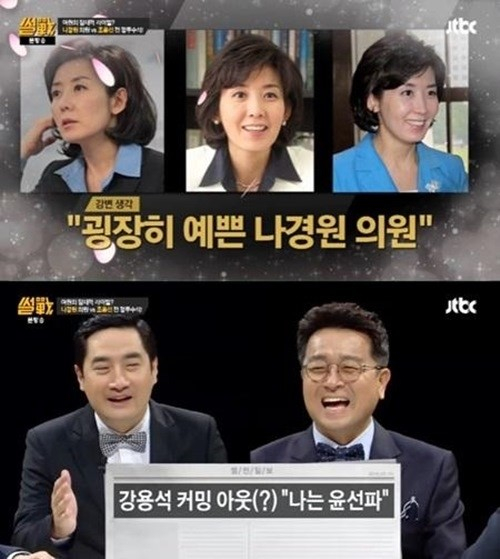 ‘썰전’에서 나경원 의원의 미모가 언급돼 이목을 끌었다. 앞서 JTBC '썰전'에서는 출연진들이 나경원 의원에 대해 이야기를 나누는 모습이 전파를 탔다.당시 방송에서 이철희 의원은 "보좌진 사이나 기자들 사이에서 나경원과 조윤선의 미모에 대해 이야기를 나누기도 한다"고 말했다.그러자 강용석 변호산느 두 사람에 대해 잘 안다면서 "조윤선 전 수석과 같은 독서실에서 고시 공부를 했으며, 사법 연수원 같은 반이어서 친했다"고 밝혀 눈길을 모았다.특히 강 변호사가 "나경원 의원은 어느 앵글에서나 다 예뻐 보이는 김태희 같은 얼굴이다"라고 말하자, 이 의원은 "혹시 경원파?"라고 물었다. 이에 그는 "나는 윤선파"라고 답해 웃음을 자아냈다.한편, JTBC ‘썰전’은 매주 목요일 밤 11시에 방송된다.