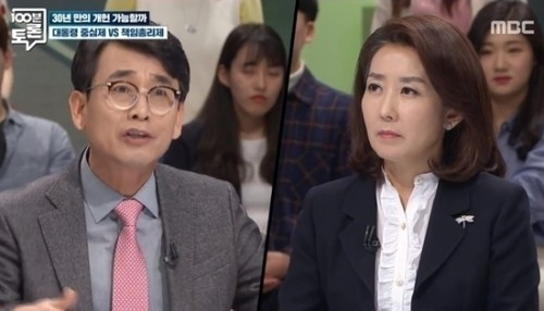 자유한국당 나경원 의원이 화제인 가운데 유시민 작가가 그녀에게 정치적 조언을 한 발언이 관심을 끈다.앞서 방송된 MBC '100분 토론'에서 유시민 작가, 나경원 자유한국당 의원, 박주민 더불어민주당 의원, 장영수 고려대 교수가 출연해 최근 이슈가 되고 있는 개헌문제에 대해 이야기를 나눴다.나 의원은 문재인 대통령이 개헌안에 토지공개념을 강화하는 조항을 삽입하는 것을 추진하고 있는 것에 대해 “사유재산을 과도하게 침해할 수 있다”며 반대 입장을 밝혔다.그러자 한 남성 시민토론단이 나경원 의원에게 “솔직히 말해서 부자들이 집 몇 채 못 갖는 게 그렇게까지 아쉽냐?”고 돌직구 질문을 날렸다.이에 나경원 의원은 “말씀을 그렇게 하시니까 제가 대답하기가 좀..이상한 논점으로 말씀하시는 것 같다”며 “토지공개념으로 부동산 투기를 잡을 수 없다고 생각한다. 부동산 투기는 세금으로 여러 가지 조정을 하고 있다”고 답했다.이날 유시민 작가는 개헌 논의에 대해 나경원 의원에게 “자유한국당이 할 것은 딱 두 가지다. 대통령의 개헌안을 도저히 통과시킬 수 없다고 생각하면 부결시켜라. 그것은 국회의 권한이다. 부결이 정치적으로 부담스러우면 여당과 밀당하라”고 조언을 했다.