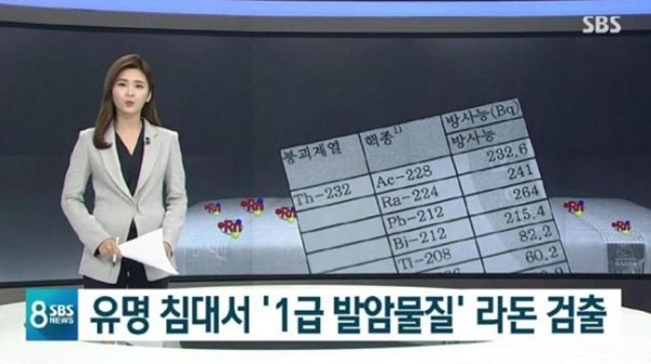 대진침대에서 1급 발암물질인 라돈이 검출돼 비상이 걸렸다.3일 SBS는 단독보도로 대진침대 제품 4개 모델에서 라돈이 검출됐다고 전했다. 보도에 따르면 기준치 200 Bq/㎥의 3배가 넘는 620Bq/㎥.희토류 원석을 갈아 만든 음이온 가루가 원인 물질인 것으로 전해졌다. 이에 대해 대진 측은 라돈 함유에 대해 몰랐다는 입장을 전했다.한편 라돈은 흙이나 바위에 있는 우라늄이 자연적으로 붕괴하며 만들어진다. 색깔도, 냄새도 없고, 초미세 먼지의 3천 5백분의 1에 불과하다. 인체로 들어오면 폐 세포를 공격하고 암을 유발한다. 라돈은 나이가 어릴수록 더 큰 피해를 준다. 한 전문의는 “한참 세포가 성장하고 분해하는 과정 중에 방사선 물질에 노출이 된다는 것은 분명히 세포의 암 발생에 장기적으로 악영향을 줄 가능성이 높다”고 경고했다.