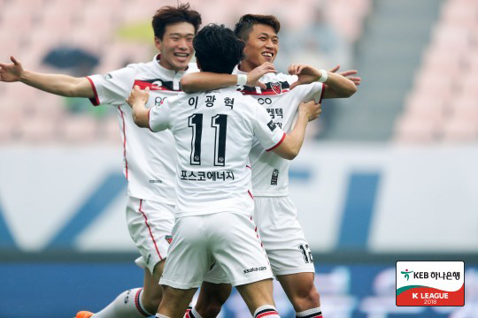 포항스틸러스가 '1강' 전북현대를 완벽하게 제압하며 최근 5경기 무승 부진에서 탈출했다. 포항은 12일 전주월드컵경기장에서 열린 KEB하나은행 K리그1 2018 13라운드 원정경기에서 김승대, 이광혁, 송승민의 릴레이포를 앞세워 전북을 3-0으로 꺾었다. 최근 5경기연속 무승(2무3패)으로 초반 상승세가 완전히 꺾인 포항은 적지에서 '대어' 전북을 잡고 귀중한 승점 3을 보태 5승3무5패(승점 18)로 8위에서 5위로 세 계단 뛰어올랐다. 특히 포항은 2015년 10월 17일(1-0승) 이후 전북에 2무5패로 철저히 눌렸으나 약 2년 7개월 만에 쾌승으로 전북전 무승 사슬도 끊어냈다. 반면 전북은 리그 초반에 쌓아 둔 승점에 여유가 있어 1위를 굳건히 지켰으나 K리그1 두 번째 패배를 당하며 리그 10경기 무패 행진도 마감됐다. 전북은 8일 부리람유나이티드(태국)와의 아시아챔피언스리그(ACL) 16강 1차전에서 2-3으로 진 데 이어 공식 경기 2연패를 기록했다. 김민재, 박원재 등의 줄 부상과 K리그, ACL 병행으로 체력 저하가 겹친 전북은 이날 태국 원정 피로가 누적된 주전을 대거 제외한 채 포항에 맞섰다. 전북을 꺾을 수 있는 절호의 기회를 잡은 포항은 경기 시작 1분 만에 선제골을 터뜨리며 쾌승의 서막을 올렸다. 이근호가 골 지역 오른쪽에서 수비의 마크를 뚫은 뒤 중앙으로 파고들던 김승대에게 연결했고, 김승대가 오른발로 가볍게 골네트를 갈랐다. 일격을 당한 전북 최강희 감독은 전반 19분 수비수 조성환을 빼고 미드필더 손준호로 교체하는 강수를 들고 나왔다. 하지만 기세가 오른 포항의 공세를 막기엔 전북 수비가 너무 허술했다. 김승대가 왼쪽 측면에서 수비수 뒤를 노리는 감각적인 패스를 내주자 강상우가 치고 들어가다 이광혁에게 내줬고, 이광혁이 왼발로 추가골을 뽑아냈다. 김승대-강상우-이광혁으로 이어지는 환상적인 골 장면이 연출됐다. 이후 전북은 '기록의 사나이' 이동국이 로페즈의 패스를 받아 오른발 대각선 슈팅으로 포항 골문을 노렸으나 골키퍼 강현무가 다리를 쭉 뻗어 막아냈다. 만약 이 골이 들어갔더라면 경기 양상은 가늠하기 어려운 혼전으로 흘러갔을 가능성이 높았다. 축구에서 2-0으로 앞서가다 2-1로 쫓기면 경기 결과를 쉽게 예측할 수 없는 상황에 놓이기 때문이다. 강현무의 선방으로 위기를 넘긴 포항은 전반 41분 아크 근처에서 과감하게 때린 송승민의 오른발 중거리 슛이 수비수 몸을 스치며 골문으로 빨려 들어가 승부에 쐐기를 박았다. 송승민은 13경기 만에 포항 데뷔골을 터뜨려 부진에도 불구하고 연속출장 기록을 잇게 해준 최순호 감독의 배려에 보답했다. 최순호 감독은 송승민의 추가골이 터지자 승리를 예감한 듯 두 팔을 치켜 올리며 함박 웃음을 지어 보였다. 전반에만 세 골을 내준 전북은 후반 시작부터 김신욱을 투입하고, 후반 16분에는 티아고 대신 아드리아노를 들여보내 만회골을 노렸다. 하지만 후반 34분 김신욱의 헤딩 패스에 이은 이동국의 발리슛이 골대를 벗어나고, 35분엔 아드리아노의 날카로운 오른발 프리킥이 강현무의 선방에 또다시 막혀 안방에서 영패 수모를 당했다.