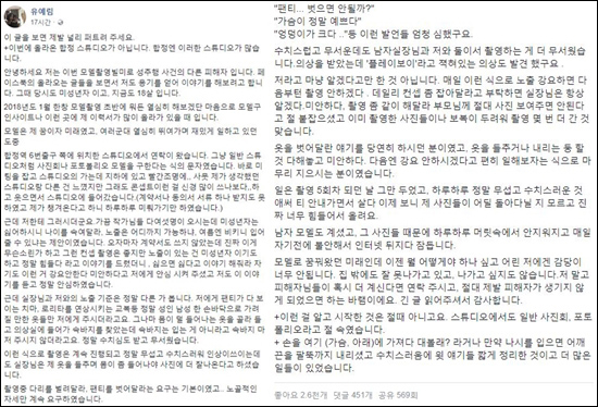 [경북신문사 = 온라인뉴스팀 기자] 유예림 폭로가 18일 인터넷 상 핫이슈로 떠올랐다.미성년자 모델 유예림(18)이 자신이 당했던 성추행을 폭로해 세간의 주목을 받고 있다.유예림은 18일 자신의 SNS를 통해 자신이 피팅 모델 일을 하러 갔다가 성추행 피해를 당했다고 폭로했다.그녀가 올린 글에 따르면 스튜디오 측에서는 차마 입에 담기에도 민망한 요구를 했다. 또 유예림은 노골적인 자세도 강요받았던 것으로 알려졌다.피팅 모델은 핏 모델(fit model)이라고 준말로 부르기도 한다. 본래 뜻은 패션 디자이너나 의류 생산자가 실제 사람에 맞게 디자인의 가봉의 적합성이나 옷감, 시각적 외양을 점검하기 위해 모델이 되는 사람을 말한다. 이번 유예림 피해에 앞서 피팅 모델 알바를 이용한 성범죄도 있었다. 2009년 여중생에게 쇼핑몰 모델을 시켜주겠다며 차량으로 유인해 성폭행한 사건이 발생한 것. 2017년에는 피팅모델을 모집한다며 여성을 모텔로 오게 해 사진 촬영을 하면서 성추행을 한 남성도 있었다.