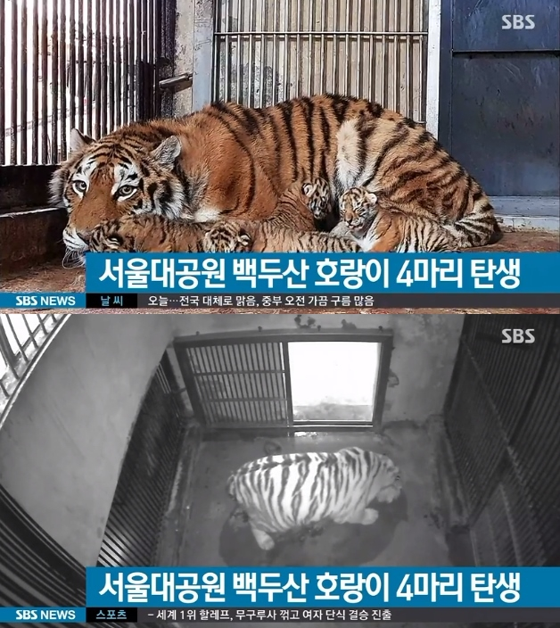 [경북신문사 = 온라인뉴스팀] 경기 과천시에 위치한 서울대공원에서 백두산호랑이 4마리가 탄생했다는 소식이 전해지며 네티즌들의 관심이 뜨겁다.8일 복수 매체는 서울대공원 동물원에서 토종 백두산호랑이 4마리가 탄생했다고 일제히 보도했다. 보도에 따르면 멸종위기에 처한 백두산호랑이인 여덟 살 조셉(수컷)과 아홉 살인 펜자(암컷) 사이에서 지난 4월2일 새끼 4마리가 태어났다. 해당 종의 호랑이가 태어난 것은 지난 2013년 이후 오년 만인 것으로 전해졌다. 특히 이처럼 호랑이 4마리가 한꺼번에 태어난 사례는 매우 드물다. 현재 호랑이 새끼 4마리의 건강상태는 양호하며, 눈을 뜬 시간에는 젖을 먹거나 이리저리 몸을 흔들며 앙증맞은 모습으로 걸음걸이를 연습하고 있는 것으로 알려졌다.백두산호랑이 새끼들은 적응훈련을 마치고 나면 올 가을께 동물원을 찾는 이용자들에게 모습을 드러낼 것으로 보인다.