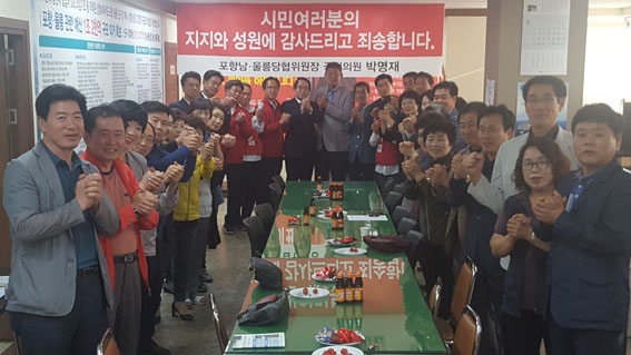 자유한국당 박명재 의원(포항남·울릉)은 14일 6·13 지방선거의 당선자와 낙선자가 함께한 해단식에서 "포항시민들의 선택을 겸허한 마음으로 무겁게 받아드리고, 어려운 상황에도 이강덕 포항시장과 김병수 울릉군수, 자유한국당의 시·도의원들을 선택해 주신데 대해 감사한 마음과 함께 죄송한 마음을 전한다"고 밝혔다.