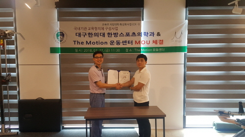대구한의대 한·양방 융합 스포츠의학 전문트레이너 양성사업단은 지난 27일 학생들의 현장실습 및 교육을 위해 The Motion 운동센터와 산학협약(MOU)을 체결했다. 협약식은 대구한의대 이영익 교수와 김현규 대표 등 10여명이 참석한 가운데 양 기관 소개 및 협약 내용 설명, 협약서 서명, 상호 협력을 위한 간담회 순으로 진행됐다.양 기관은 이번 협약을 통해 ▲학생 현장실습 및 현장교육 협조 ▲학생 취업 적극 협력 ▲교육프로그램 개발 및 운영 ▲양 기관 발전에 필요한 공동연구 및 홍보 ▲기타 상호 발전에 필요한 제반사항에 대해 적극 협력하기로 했다.The Motion 운동센터 김현규 대표는 대구한의대 체육학과와 한방스포츠의학과를 복수전공으로 학위를 취득한 졸업생으로, 더 모션 평가시스템(체성분검사, 자세검사, 심부근육검사, 밸런스검사, 움직임 패턴 검사 등)에 의한 정확한 평가를 통해 개인의 특성에 맞는 맞춤형 운동을 제공하고 있다.양 기관은 이번 협약을 통해 한방스포츠의학센터의 근기능 검사, 운동부하검사장비를 활용해 다양한 연계활동을 진행 할 예정이다.