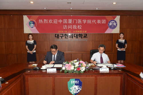 대구한의대가 중국 하문의학원과 학생들의 교류를 통한 글로벌 역량 강화에 나선다.22일 대구한의대는 본관 대회의실에서 하문의학원과 자매결연 업무협약(MOU)을 체결했다고 밝혔다.하문의학원은 임상의학, 재활의학, 간호학 등 의약학을 중심으로 한 4년재 학사과정과 의학미용기술, 화장품경영관리와 같은 3년제 전문학사 과정을 운영하고 있다.이번 협약으로 양 기관은 ▲교육 및 과학 연구의 공동 추진 ▲교수 및 연구원 교류 ▲교환학생, 복수학위 등 학생 교류 ▲상호이해와 협력 증진을 위한 친선 교류 ▲기타 상호 발전에 필요한 제반사항에 대해 적극 협력한다.변창훈 대구한의대 총장은 "중국 의약학산업 발전에 기여할 인재를 양성하고 있는 하문의학원과의 이번 협약으로 화장품산업과 제약산업, 건강기능성식품 등 산업발전을 위해 연구할 글로벌 인재를 양성하겠다"고 말했다.