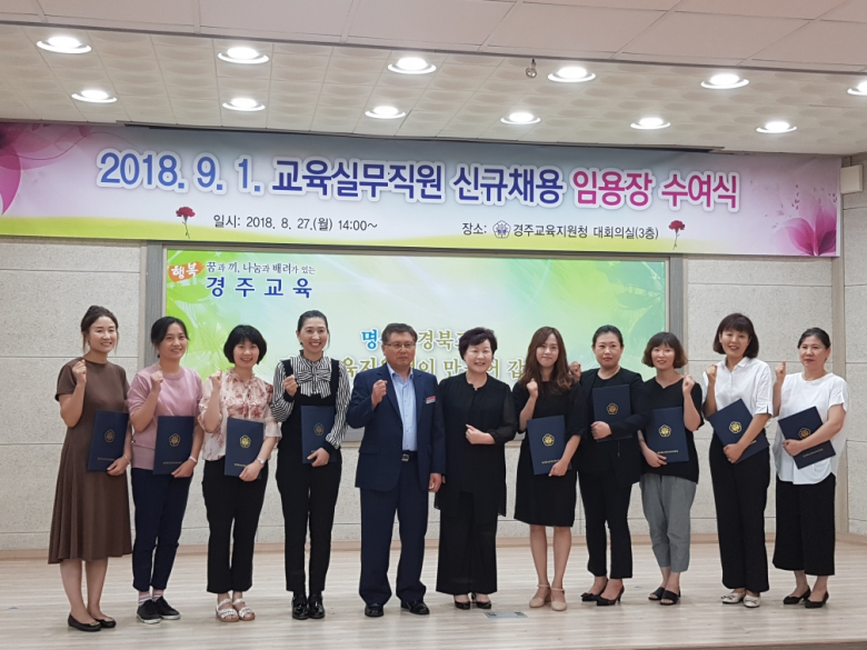 경주교육지원청은 27일 3층 대회의실에서 9월 1일자 신규채용 발령 예정인 교육실무직원(조리원) 9명에게 임용장 수여했다.