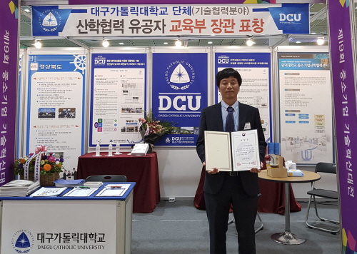 대구가톨릭대는 중소벤처기업부 주최로 지난달 30일 서울 코엑스에서 열린 '제19회 중소기업기술혁신대전'에서 산·학·연 협력사업으로 지역 중소기업의 기술력과 생산성을 높인 공로를 인정받아 기술협력 분야(단체) 교육부장관 표창을 받았다.대가대 산학협력단 중소기업산학협력센터는 지난 2000년부터 18년 동안 지역 중소기업과 총 208건의 산학협력사업을 추진했다. 354명의 교수와 연구원이 참여해 특허 50건, 시작품 제작 187개, 공정개선 92건, 상품화 37개 등의 성과를 거두며 지역산업의 기술개발을 지원하고 애로기술을 해결하는데 기여했다.