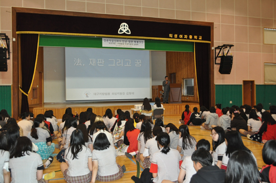 의성여중(교장 손장식)은 지난 2일 대구지방법원의성지원 김형태 지원장(이하 김형태 지원장)을 초청해 법관 특별강연을 가졌다. 이번 강연은 '대한민국 사법부 70주년 및 법원의 날'을 기념하여 대구지방법원의성지원에서 관내 초·중·고 학생들을 대상으로 다양한 법원 체험 프로그램을 제공한 행사의 일환이다.