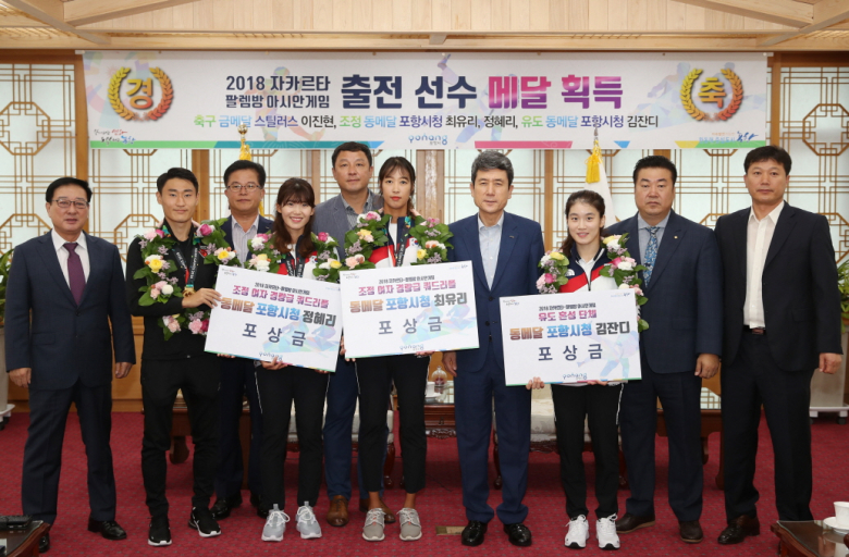 포항시는 7일 시청 대외협력실에서 2018 인도네시아 자카르타-팔렘방 아시안게임에 참가한 선수들을 초청해 격려했다. 이날 행사에는 축구 금메달을 획득한 포항스틸러스 소속 이진현 선수, 조정 동메달을 획득한 포항시청 최유리 선수, 정혜리 선수와 유도 동메달을 획득한 포항시청 김잔디 선수, 그리고 포항스틸러스 장영복 단장, 조정 김구현 감독, 유도 전광수 감독, 포항시체육회 문충국상임부회장, 포항시유도회 이문석 회장 등 20여명이 참석했다. 이 날 포철동초, 포철중·고를 거친 지역출신인 축구 이진현 선수는 “선수들 간의 하나된 팀워크로 금메달이라는 좋은 결과를 가져올 수 있었다”고 소감을 전했다. 또한 조정에 대해초, 동지여중·고를 나온 최유리, 정혜리 선수는 “첫 아시안게임 출전으로 안타깝게 동메달에 그쳐 아쉽다”는 소감을 남겼고, 아시안게임에 3번째 도전한 유도 김잔디 선수는 “굉장히 특별했던 대회였다”고 말했다. 이강덕 시장은 선수들에게 축하와 격려를 아끼지 않았으며 포항시의 명예를 드높여준 선수들에게 고마움을 표시했다. 또한 앞으로 더 많은 훌륭한 선수들이 배출될 수 있도록 스포츠 인프라 구축 등 최대한 노력과 지원을 아끼지 않겠다고 말했다. 한편, 이번 아시안게임에는 이 외에도 이재복 선수(포스코건설)가 럭비 동메달, 지역 출신인 곽동한 선수(하이원)가 유도 금메달과 동메달을, 김동현 선수(국군체육부대)가 탁구 은메달을, 레슬링에서 김재강 선수(칠곡군청)와 남경진 선수가(울산남구청) 동메달을 획득했다.