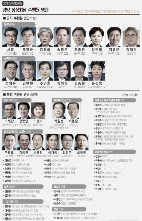 남북 정상회담 준비위원장을 맡고 있는 임종석 대통령 비서실장은 16일 문재인 대통령을 수행해 평양 남북 정상회담에 동행할 수행원 명단을 최종 확정 발표했다.