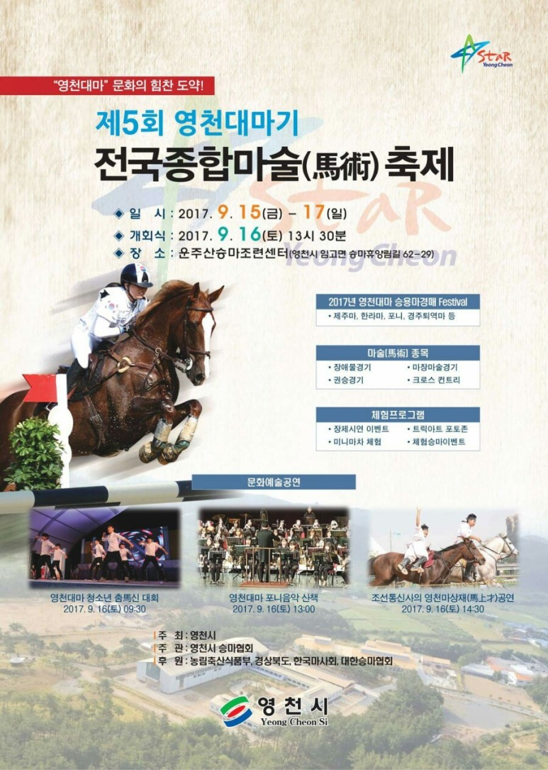 한편 올해 6회를 맞이한 '영천대마기 전국종합 마술(馬術)축제'는 매회 깔끔한 진행과 발전을 거듭하며 생활승마체육인들 사이에서 좋은 승마대회로 평판이 나면서 가을 시즌에 반드시 참여해야 될 대회로 명성을 얻고 있다.