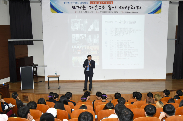 주낙영 경주시장이 10일 위덕대학교 갈마관에서 대학생 200여 명을 대상으로 '뜨거운 가슴으로 높이 비상하라'는 주제의 소통 특강을 가졌다.