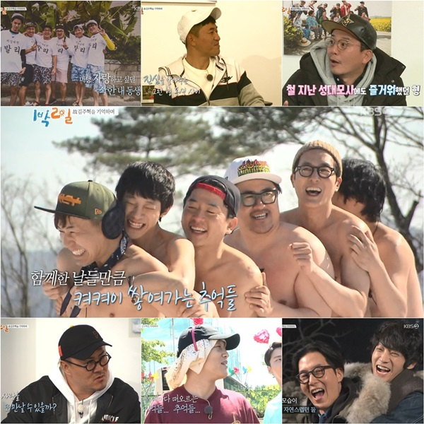 이날 故김주혁 추억 소환 여행을 위해 특별히 그의 가장 절친했던 배우 한정수와 정기진이 자리한 가운데 정기진은 “주혁이가 처음으로 소개해준 연예인 친구가 ‘1박 2일’ 친구들”이라며 故김주혁 덕분에 이뤄진 소중한 인연을 소개했고 여섯 멤버들은 각자의 방식으로 애틋했던 故김주혁과의 추억을 회상했다. 더욱이 ‘1박 2일’ 연출을 맡았던 유호진 전임 PD, 영화 <광식이 동생 광태>를 함께한 배우 봉태규, 영화 <공조> 김성훈 감독, 소속사 김종도 대표, ‘전원일기’ 편에서 엄마와 아들로 따뜻한 감동을 안긴 김점순 할머니 등이 함께해 눈길을 끌었다.故김주혁과 함께 찍은 사진이 가장 많았던 데프콘이 “저 사람(故김주혁)을 챙겨야겠다는 느낌이 강했다”며 故김주혁과의 첫 만남 당시 속마음을 털어놓은 가운데 막내 정준영과 김준호와 형제애도 회자됐다. 유호진 전임 PD는 “사석에서도 준영이가 주혁이 형을 진짜 따랐다”는 말로 17살 나이 차이를 뛰어넘는 故김주혁과 정준영의 끈끈한 형제애를 밝혔고 김준호는 자신의 성대모사에 항상 배꼽잡고 웃어주던 故김주혁을 기억했다.특히 멤버들은 ‘1박 2일’ 촬영 동안 항상 최선을 다했던 故김주혁에 대해 칭찬을 아끼지 않았다. 망가짐 불사는 물론 본인이 가장 싫어했던 노래 부르기와 냉수 마찰 등을 거리낌없이 해내며 매사에 열심이던 故김주혁. 여섯 멤버들 모두 입을 모아 ‘금연 여행’, ‘김제 신덕마을’ 편이 가장 기억에 남는다 말했고 ‘1박 2일’과 故김주혁의 아쉬움 가득했던 이별에 대해 김종도 대표는 “주혁이가 우는 걸 많이 안 봤는데 마지막에 차 탈 때 촌스러운 울음이 터진 걸 보고 이 친구가 ‘1박 2일’에 대한 애정이 남달랐구나 생각했다”고 말해 눈길을 끌었다. 마지막으로 데프콘은 “이런 사람을 또 만날 수 있을까?라는 생각을 한다”며 차태현은 “여행지 곳곳마다 남겨진 형 흔적을 볼 때 가장 그립다”라는 말로 애틋함을 드러내는 등 멤버들 모두 각자 다른 방식으로 고인을 그렸다.이처럼 故김주혁에게 최고 웃긴 동생 김준호에서 믿음직한 동생 차태현, 항상 챙겨주고 싶은 동생 데프콘, 말하지않아도 서로의 진심을 알아줬던 김종민, 순수하게 서로를 좋아했던 막내 정준영까지. 故김주혁과 함께 했던 행복했던 기억 속 그와 함께한 2년 추억은 여전히 현재진행형(-ing)로 모두의 가슴에 영원히 남을 것을 기약했다.이날 방송 후 각종 온라인 커뮤니티 사이트와 SNS 등에서 “구탱이형 첫 화부터 하드캐리했잖아”, “하나하나 기억나네”, “구탱이형 ‘1박 2일’ 그만두고도 애정이 많았었지”, “구탱이형이 멤버들 사랑한 거 이상으로 멤버들도 구탱이형 진심이잖아. 정말 이멤버 리멤버 포에버”, “마지막 날 스태프들이 엉엉 울기 시작하니까 왜 우냐면서 억지로 참으면서 웃는 표정이 아직도 생생”, “정말 재미 이상으로 멤버들 합이랑 서로가 서로를 진심으로 좋아하는 게 보였다” 등 반응을 보였다.<사진제공> KBS 2TV ‘1박 2일’ 캡처