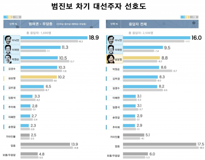 범진보·무당층(더불어민주당·정의당·민주평화당 지지층과 무당층 응답자 1,690명)에서는 이 총리가 9월 집계 대비 2.7%포인트 오른 18.9%의 지지율을 기록했다.