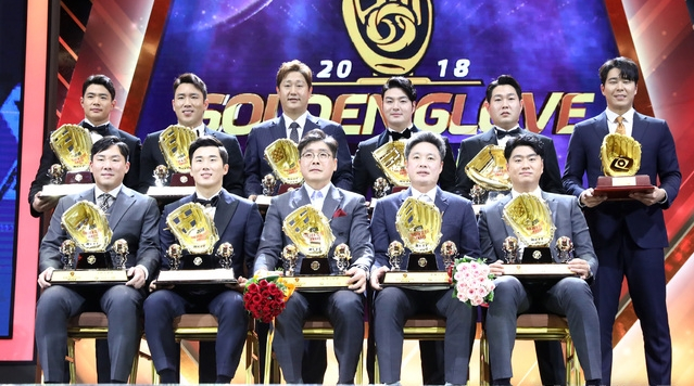 2018 신한은행 마이카 KBO(프로야구) 골든글러브 시상식이 서울 코엑스에서 성대하게 막을 내렸다. 한국야구위원회(KBO)는 10일 서울 삼성동 코엑스 오디토리움에서 ‘2018 신한은행 MY CAR KBO리그 골든글러브 시상식’을 개최했다. 골든글러브 선정 투표는 올 시즌 KBO리그를 담당한 취재기자와 사진기자, 중계방송사 PD, 아나운서, 해설위원 등 미디어 관계자가 온라인 투표를 실시했다. 총 투표인단은 385명, 유효 투표수 349표로 투표율은 90.6%를 기록했다.영예의 수상자는 1루수 박병호(넥센 히어로즈), 2루수 안치홍(KIA타이거즈), 3루수 허경민(두산 베어스), 유격수 김하성(넥센 히어로즈), 외야수 김재환(두산 베어스), 전준우(롯데 자이언츠), 이정후(넥센 히어로즈)가 황금장갑을 품에 안았다. 지명타자는 이대호(롯데 자이언츠), 투수와 포수는 두산의 배터리, 조쉬 린드블럼과 양의지가 각각 이름을 올렸다.수상자에게는 ZETT가 협찬하는 골든글러브 트로피와 500만원 상당의 용품 구매권이 수여된다. 또 두산 베어스 양의지 최다 득표(331표) 및 최다 득표율(94.8%)의 영광을 차지했다. 양의지는 수상 소감으로 “니퍼트에게 감사하다. 방송 볼지 모르겠지만 항상 제 마음속 1선발이라고 깊이 새겨두고 있다고 전하고 싶습니다.”며 눈시울을 붉혔다.도핑 전력에도 시즌 MVP에 선정돼 논란이 일었던 김재환이 골든글러브를 차지했고, 타격왕 LG 김현수, 40홈런을 넘긴 KT 로하스, SK 한동민 대신 객관적인 기록에서 뒤지는 넥센 이정후가 수상해 의문이 일고 있다.롯데 이대호는 6번째, 넥센 박병호는 4번째 황금장갑의 주인공이 됐고, 안치홍은 2년 연속 2루수 골든글러브를 받았다.