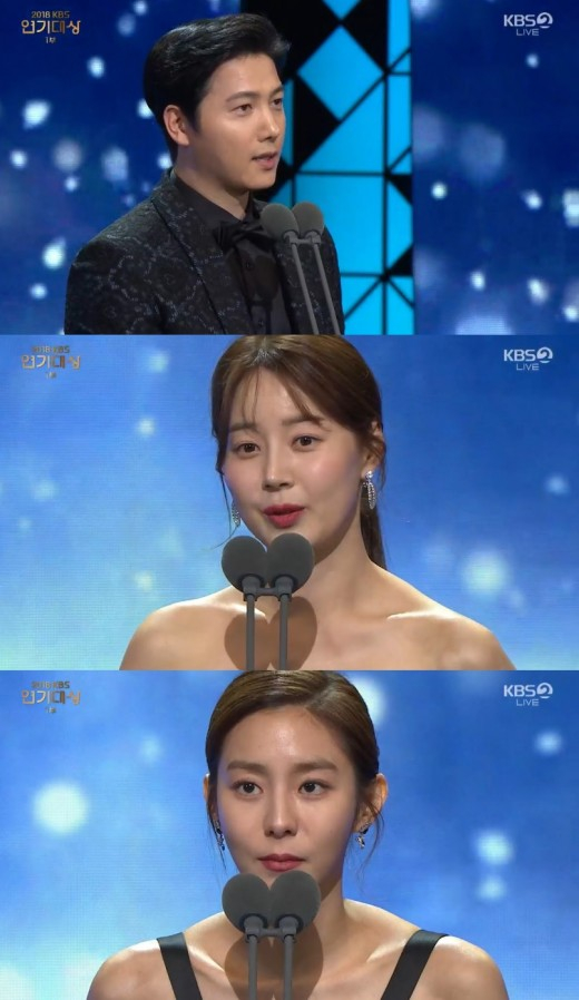 배우 한지혜(34)와 유이(30), 이상우(38), 이장우(32) 등이 우수상을 안았다. 한지혜와 유이는 31일 서울 영등포구 여의도동 KBS홀에서 열린 ‘2018 KBS 연기대상’에서 각각 ‘같이 살래요’와 ‘하나뿐인 내편’으로 장편 드라마 부문 여자 우수상을 차지했다. 한지혜는 제작진 및 가족 등에게 감사 인사를 했다. 유이는 “이 상을 받을 줄 몰랐다. 신인상 받은 뒤 7년 만이다”면서 “‘하나뿐인 내편’은 내년 3월까지 방송한다. 끝까지 좋은 드라마로 남았으면 한다”며 눈물을 보였다.장편 드라마 부문 남자 우수상은 ‘같이 살래요’ 이상우와 ‘하나뿐인 내편’ 이장우가 받았다. 이상우는 “KBS에서 처음 받는 상이다”라며 “‘같이 살래요’를 함께하고 도와준 모든 분에게 감사한다”고 전했다. 이어 “사람 많은 데서 말을 잘 못 하는데 용기 내 말하고 싶다. 소연아 사랑해”라는 말로 아내인 배우 김소연(38)을 향해 애정을 드러냈다. 두 사람은 지난해 6월 결혼했다. 이장우는 “조금만 더 도와달라”며 “‘하나뿐인 내편’ 시청률이 40%가 넘었으면 좋겠다”고 바랐다. 일일극 부문 우수상은 ‘이름없는 여자’ 박윤재(37), ‘끝까지 사랑’ 강은탁(36), ‘차달래 부인의 사랑’ 하희라(49), ‘인형의 집’ 박하나(33)에게 돌아갔다.  뉴시스
