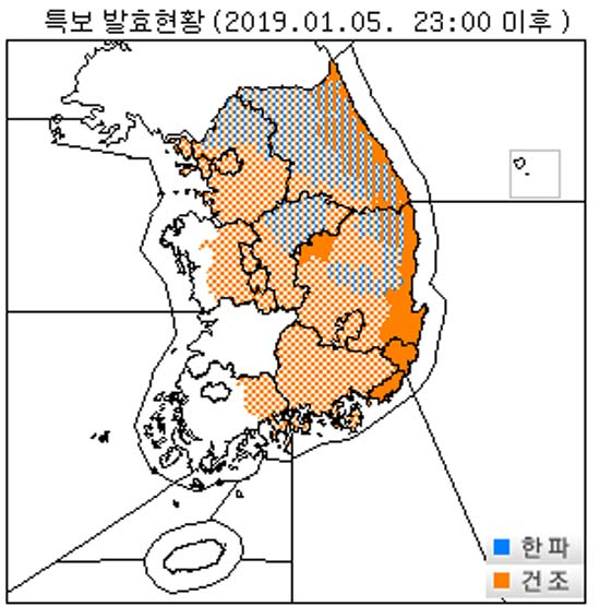 [경북신문=박해숙 기자]일요일인 1월 6일 오전 4시 40분 현재, 전국이 구름많은 날씨를 보이고 있는 가운데 오늘은 중국 산둥반도 부근에 위치한 고기압의 영향을 차차 받아 전국이 구름많다가 낮부터 맑아지겠으나, 제주도는 가끔 구름많겠다.* 예상 적설/강수량(6일 밤까지)- 울릉도.독도: 1~3cm/5mm 내외오늘 미세먼지 농도는 대기 확산이 원활해 전국 대부분 지역에서 '보통' 수준을 보일 것으로 전망된다.내일(7일)은 중국 상해 부근에 위치한 고기압의 영향을 받다가 그 가장자리에 들어 전국이 대체로 맑다가 오후부터 구름많아지겠고, 중부서해안에는 밤부터 모레(8일) 새벽 사이에 산발적으로 눈이 날리는 곳이 있겠다. 제주도는 가끔 구름많겠다.모레(8일)는 중국 북부지방에서 확장하는 고기압의 영향을 차차 받아 전국이 구름많다가 낮부터 맑아지겠으나, 전라도와 제주도는 가끔 구름많겠다.< 한파, 기온 현황과 전망 >기온은 당분간 평년과 비슷한 분포를 보이겠으나, 한파특보가 발효 중인 경기북부와 강원영서, 충북북부, 경북북부에는 오늘과 내일(7일) 아침 기온이 영하 10도 이하로 떨어지는 곳이 있겠으니, 건강과 농축수산물 관리, 수도관 동파 예방 등 시설물 관리에 각별히 유의해야 한다.< 건조 현황과 전망 >지난 12월 13일 강원동해안을 시작으로 현재 전국 대부분 지역(충남서해안, 일부 전라도, 제주도 제외)에 건조특보가 장기간 이어지고 있다. 특히, 일부 서해안을 제외한 대부분 지역의 실효습도는 40% 이하이고, 동해안지역은 25% 이하로 매우 건조한 상태다.* 실효습도: 목재 등의 건조도를 나타내는 지수로 실효습도가 낮을수록 건조함을 의미함.따라서 건조한 대기로 인해 화재 발생 가능성이 매우 높고, 특히, 해안과 산지에는 바람도 강하게 불어 화재 발생시 큰 불로 이어질 수 있으니, 산불 등 각종 화재에 각별히 유의해야 한다.< 강풍 전망 >강원산지에는 내일(7일) 오후부터, 해안에는 모레(8일)부터 바람이 강하게 불겠고, 내륙에도 약간 강하게 부는 곳이 있겠으니, 시설물 관리에 유의해야 한다.< 해상 전망 >오늘은 제주도남쪽먼바다에 바람이 강하게 불며 물결이 높게 일겠고, 다시 내일(7일) 밤 동해먼바다를 시작으로 모레(8일)는 대부분 해상에 바람이 강하게 불며 물결이 높게 일겠으니, 항해나 조업하는 선박은 각별한 유의가 필요하다.또한, 오늘 오전까지 동해안에는 너울로 인해 높은 물결이 해안도로나 방파제를 넘는 곳이 있겠으니, 해안가 안전 사고에 각별히 유의해야 한다. o 한파주의보 : 경상북도(경북북동산지, 영양평지, 봉화평지, 청송, 의성), 충청북도(제천, 음성, 충주, 괴산), 강원도(강원북부산지, 강원중부산지, 강원남부산지, 양구평지, 정선평지, 평창평지, 홍천평지, 인제평지, 횡성, 춘천, 화천, 철원), 경기도(가평, 파주, 양주, 포천, 연천, 동두천)o 건조경보 : 울산, 부산, 경상북도(경북북동산지, 울진평지, 문경, 경주, 포항, 영덕), 강원도(강원북부산지, 강원중부산지, 강원남부산지, 삼척평지, 동해평지, 강릉평지, 양양평지, 고성평지, 속초평지, 태백)o 건조주의보 : 세종, 대구, 대전, 인천(옹진군 제외), 서울, 경상남도, 경상북도(영양평지, 봉화평지, 청도, 청송, 의성, 영주, 안동, 예천, 상주, 김천, 칠곡, 성주, 고령, 군위, 경산, 영천, 구미), 전라남도(순천, 광양, 여수, 구례, 곡성), 충청북도, 충청남도(계룡, 예산, 청양, 부여, 금산, 논산, 아산, 공주, 천안), 강원도(양구평지, 정선평지, 평창평지, 홍천평지, 인제평지, 횡성, 춘천, 화천, 철원, 원주, 영월), 경기도