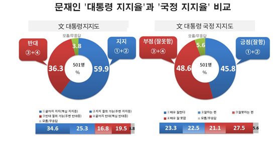 [경북신문=박해숙 기자]여론조사 전문기관 리얼미터 조사 결과 문재인 대통령의 국정수행 평가에서는 부정평가가 긍정평가(국정 지지율)보다 다소 우세했지만, 문 대통령 개인에 대한 지지 여부에서는 지지(대통령 지지율)가 반대보다 크게 우세한 것으로 조사됐다.현재 거의 모든 조사기관에서 대통령 지지율을 대통령 국정수행 긍정평가인 국정 지지율로 측정하고 있는 가운데, tbs 의뢰로 여론조사 전문기관 리얼미터(대표 이택수)가 현재 문재인 대통령 개인에 대한 지지 여부(문 대통령 지지율)를 조사한 결과, '임기 끝까지 지지할 것이다'는 핵심 지지층이 34.6%, '현재는 지지하지만 상황에 따라 지지를 안 할 수도 있다'는 주변 지지층이 25.3%로, 현재 문 대통령에 대한 지지율이 10명 중 6명인 59.9%로 집계됐다.'임기 끝까지 반대할 것이다'는 핵심 반대층은 19.5%, '현재는 반대하지만 상황에 따라 지지할 수도 있다'는 주변 반대층은 16.8%로, 현재 문 대통령에 대한 반대율은 36.3%로 나타났다. '모름/무응답'은 3.8%.이러한 문 대통령에 대한 지지 여부는 동일한 조사에서 같이 실시한 문 대통령의 국정수행 평가와는 상당히 다른 결과이다. 문 대통령의 국정수행 긍정평가(국정 지지율)는 45.8%(매우 잘한다 23.3%, 잘하는 편이다 22.5%)로 집계됐는데, 문 대통령의 지지율(59.9%)은 이보다 14.1%p 더 높았다. 또한 문 대통령에 대한 반대 응답(36.3%)은 국정수행 부정평가 48.6%(매우 잘못한다 27.5%, 잘못하는 편이다 21.1%)보다 12.3%p 낮았다.즉, 조사 당일 현재 문 대통령의 국정수행에 대한 부정평가가 긍정평가보다 우세하지만, 문 대통령에 대한 지지 여부를 묻는 질문에서는 지지가 반대보다 더 높은 것이다.이와 같은 문 대통령 지지율과 국정 지지율 간 상이한 결과는 세부 분석에서도 나타나는데, 문 대통령이 국정수행을 ‘잘못하는 편이다’고 응답한 약한 부정평가층(지지 51.6% vs 반대 45.1%)에서도 여전히 지지가 우세한 양상이었다.지역·계층별로도 문 대통령의 국정수행 평가는 부산·울산·경남(PK)와 대구·경북(TK), 충청권, 경기·인천, 60대 이상과 50대, 남성과 여성, 무당층에서 부정평가가 우세하거나 긍·부정 평가가 팽팽하게 엇갈린 반면, 문 대통령에 대한 지지 여부는 이들 지역과 연령층을 포함한 모든 지역, 모든 연령층, 남녀 모두, 무당층 등 대부분의 지역과 계층에서 지지가 반대보다 우세했다.문 대통령의 국정수행에 대한 약한 부정평가층에서도 문 대통령 개인에 대한 지지가 반대보다 더 높고, 다수의 지역과 연령층에서 부정평가가 우세함에도 대통령에 대한 지지는 모든 지역과 연령층에서 반대보다 높은 것은, 문 대통령이 국정수행을 잘못한다고 부정적으로 인식하고 있더라도 여전히 문 대통령 개인에 대한 신뢰와 기대가 높다는 것을 의미하는 것으로 보인다.국정수행 긍·부정 평가(국정 지지율)별로는, ‘매우 잘한다’는 강한 긍정평가층(지지 98.2% vs 반대 1.8%)과 ‘잘하는 편이다’는 약한 긍정평가층(90.9% vs 4.5%), ‘매우 잘못한다’는 강한 부정평가층(11.0% vs 86.8%)에서는 각각 압도적인 다수가 문 대통령을 지지하거나 반대했다. 하지만 국정수행을 ‘잘못하는 편이다’고 응답한 약한 부정평가층(지지 51.6% vs 반대 45.1%)에서는 문 대통령을 여전히 지지한다는 응답이 절반을 넘는 것으로 나타났다.지역별로는 국정수행 평가에서는 광주·전라(긍정 62.0% vs 부정 34.0%)와 서울(51.9% vs 46.1%)에서는 긍정평가가, 부산·울산·경남(31.1% vs 60.4%)과 대구·경북(38.4% vs 59.0%), 대전·세종·충청(41.2% vs 44.1%)은 부정평가가 우세했고, 경기·인천(47.2% vs 48.3%)에서는 긍·부정 평가가 팽팽하게 엇갈렸다. 하지만 대통령에 대한 지지 여부에서는 광주·전라(지지 73.7% vs 반대 21.8%)와 대전·세종·충청(63.1% vs 32.4%), 경기·인천(61.0% vs 38.3%), 서울(60.1% vs 33.1%), 대구·경북(56.4% vs 43.6%), 부산·울산·경남(48.1% vs 45.0%) 등 모든 지역에서 문 대통령을 지지하는 것으로 조사됐다.연령별로는 국정수행 평가에서는 30대(긍정 59.3% vs 부정 38.4%)와 40대(56.4% vs 40.6%), 20대(45.6% vs 42.6%)는 긍정평가가 우세한 반면, 60대 이상(34.4% vs 59.6%)과 50대(38.1% vs 56.6%)에서는 부정평가가 우세했으나, 대통령에 대한 지지 여부에서는 20대(지지 74.2% vs 반대 22.2%)와 30대(66.6% vs 26.8%), 40대(65.3% vs 34.7%), 50대(51.0% vs 45.0%), 60대 이상(48.3% vs 46.5%) 등 모든 연령층에서 대다수가 문 대통령을 지지하거나 지지하는 양상이었다.성별로는 국정수행 평가에서 남성(긍정 46.1% vs 부정 51.7%)은 부정평가가 우세했고, 여성(45.4% vs 45.6%)은 긍·부정 평가가 팽팽하게 맞섰으나, 대통령 지지 여부별로는 여성(지지 61.7% vs 반대 33.2%)과 남성(57.9% vs 39.4%) 모두에서 대다수가 문 대통령을 지지하는 것으로 나타났다.이념성향별로는 국정수행 평가에서는 진보층(긍정 69.0% vs 부정 26.6%)에서만 긍정평가가 앞섰고, 보수층(24.8% vs 71.0%)과 중도층(41.2% vs 54.8%)에서는 부정평가가 우세했으나, 대통령 지지 여부별로는 진보층(지지 79.8% vs 반대 18.3%)과 중도층(60.4% vs 38.6%)에서 문 대통령에 대한 지지가 우세했고, 보수층(35.6% vs 58.0%)에서만 반대가 우세했다.지지정당별로는 국정수행 평가에서 민주당(긍정 84.1% 