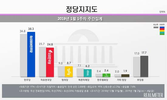 -민주당, 소폭 오르며 다시 30%대 후반으로 상승. 서울·경인·PK, 40대·60대이상, 보수층 결집, TK·충청·호남, 20대·30대, 진보층은 이탈-한국당, 지난 2주 동안의 오름세 멈췄으나 주 후반 반등하며 20%대 중반 유지. 호남서울경인PK, 30대 이상, 보수층 이탈, 충청TK, 20대, 진보층은 결집-정의당, 진보층 이탈하며 소폭 하락-바른미래당, TK·20대·중도층 이탈로 하락세-민주평화당, 지난주와 동률로 횡보여론조사 전문기관 리얼미터(대표 이택수)가 YTN 의뢰로 12월 31일(월)부터 1월 4일(금)까지 1일(화)을 제외한 나흘 동안 전국 19세 이상 유권자 25,633명에게 통화를 시도해 최종 2,008명(무선 80 : 유선 20)이 응답을 완료한 2019년 1월 1주차 주간집계 결과, 정당 지지도에서는 더불어민주당이 1주일 전 12월 4주차 주간집계 대비 1.5%p 오른 38.3%로 다시 30%대 후반으로 상승했다.민주당은 서울과 경기·인천, 호남, 50대와 40대, 60대 이상, 중도층에서 상승한 반면, 충청권, 부산·울산·경남(PK)과 대구·경북(TK), 20대와 30대, 진보층과 보수층에서는 하락한 것으로 조사됐다.자유한국당은 0.9%p 내린 24.8%로 지난 2주 동안의 오름세가 멈췄다. 하지만 주 후반 반등하며 20%대 중반을 유지했다.한국당은 호남, 서울과 경기·인천, PK, 30대와 50대, 40대, 60대 이상, 보수층을 중심으로 내렸다. 충청권과 TK, 20대, 진보층에서는 오른 것으로 나타났다.정의당 역시 진보층의 이탈로 0.3%p 내린 8.7%를 기록했고, 바른미래당 또한 TK와 20대, 중도층에서 하락하며 0.9%p 내린 6.2%로 조사됐다. 민주평화당은 1주일 전과 동률인 2.4%로 횡보했다.이어 기타 정당이 0.1%p 내린 1.9%, 무당층(없음·잘모름)은 0.7%p 증가한 17.7%로 집계됐다.더불어민주당은 일간으로 1주일 전 금요일(28일)에 37.4%로 마감한 후, 31일(월)에는 38.4%로 올랐고, 2일(수)에는 38.0%로 내린 데 이어, 3일(목)에도 37.8%로 하락했으나, 4일(금)에는 38.5%로 다시 상승하며, 1월 1주차 최종 주간집계는 1주일 전 12월 4주차 주간집계 대비 1.5%p 오른 38.3%로 마감됐다.주간집계로 지역별로 서울(▲5.6%p, 37.6%→43.2%), 경기·인천(▲4.7%p, 35.5%→40.2%), 광주·전라(▲1.1%p, 53.7%→54.8%), 연령별로는 50대(▲5.6%p, 30.8%→36.4%), 40대(▲4.2%p, 44.1%→48.3%), 60대 이상(▲2.6%p, 27.2%→29.8%), 이념성향별로는 중도층(▲1.2%p, 36.0%→37.2%)에서 상승한 반면, 대전·세종·충청(▼6.2%p, 44.4%→38.2%)과 대구·경북(▼2.6%p, 27.9%→25.3%), 부산·울산·경남(▼1.7%p, 29.0%→27.3%), 20대(▼5.0%p, 36.9%→31.9%)와 30대(▼1.9%p, 49.9%→48.0%), 진보층(▼3.1%p, 59.1%→56.0%)과 보수층(▼1.1%p, 17.8%→16.7%)에서는 하락했다.