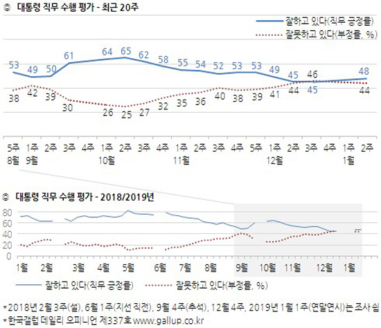 한국갤럽이 2019년 1월 둘째 주(8~10일) 전국 성인 1,002명에게 문재인 대통령이 대통령으로서의 직무를 잘 수행하고 있다고 보는지 잘못 수행하고 있다고 보는지 물은 결과, 48%가 긍정 평가했고 44%는 부정 평가했으며 9%는 의견을 유보했다(어느 쪽도 아님 5%, 모름/응답거절 4%).대통령 직무 긍정률은 직전 조사(3주 전, 2018년 12월 셋째 주) 대비 3%포인트 상승, 부정률은 2%포인트 하락했다. 직무 긍정률은 취임 후 최저치(45%)를 벗어났으나 부정률과의 격차는 4%포인트, 즉 표본오차 크기(±3%포인트)에 가까워 사실상 긍·부정률이 비슷한 상태다. 연령별 긍/부정률은 20대 51%/37%, 30대 59%/34%, 40대 58%/35%, 50대 40%/55%, 60대+ 35%/53%다. 지지정당별로 보면 더불어민주당 지지층의 79%, 정의당 지지층의 58%는 대통령 직무 수행에 대해 긍정적으로 평가했지만, 자유한국당 지지층은 90%가 부정적이며 지지정당이 없는 무당(無黨)층에서도 부정적 견해가 더 많았다(긍정 29%, 부정 52%).대통령 직무 수행 긍정 평가자에게 그 이유를 물은 결과(475명, 자유응답) '북한과의 관계 개선'(25%), '최선을 다함/열심히 한다'(9%), '서민 위한 노력/복지 확대'(8%), '외교 잘함'(7%), '대북/안보 정책'(6%), '소통 잘함/국민 공감 노력'(5%), '최저임금 인상', '개혁/적폐 청산/개혁 의지'(이상 4%), '경제 정책', '전 정권보다 낫다'(이상 3%), '일자리 창출/비정규직 정규직화', '정직함/솔직함/투명함'(이상 2%) 순으로 나타났다. 직무 수행 부정 평가자는 부정 평가 이유로(436명, 자유응답) '경제/민생 문제 해결 부족'(46%), '대북 관계/친북 성향'(12%), '일자리 문제/고용 부족', '최저임금 인상'(이상 5%), '세금 인상'(3%), '독단적/일방적/편파적', '신뢰할 수 없음/비호감', '서민 어려움/복지 부족', '인사(人事) 문제', '과거사 들춤/보복 정치', '부동산 정책'(이상 2%) 등을 지적했다. 문재인 대통령은 1월 10일 신년 기자회견을 통해 '평화·혁신성장·포용국가'라는 기치 아래 향후 국정 운영 방향과 정책을 설명하고, 90분간 청와대 내외신 출입기자단과 질의응답을 직접 진행했다. 그러나 이번 기자회견은 조사 기간 사흘 중 마지막 날 행사였으므로, 조사 결과 반영 정도는 크지 않다.