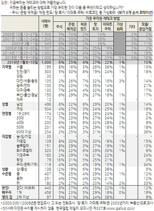 한국갤럽이 2019년 1월 8일부터 10일까지 전국 성인 1,002명에게 가장 유리한 재테크 방법을 물은 결과(보기 6개 순서 로테이션 제시), '땅/토지'(27%)와 '아파트/주택'(22%) 등 응답자의 49%가 '부동산'을 꼽았고 그다음은 '은행 예적금'(25%), '주식'(6%), '채권/펀드'(4%), '비트코인 등 가상화폐'(1%) 순이었으며 15%는 의견을 유보했다.과거 조사와 비교하면 '부동산'은 2000년 14%에서 2006년 54%까지 증가, 2014년 38%로 하락했으나 2018년 다시 50%로 늘었고 정부의 투기 억제 정책하에 있는 2019년 들어서도 여전하다. 반면 '은행 예적금'은 2000년 74%에 달했지만 이후 지속적으로 하락해 2018년 23%, 2019년 25%다. 국내 주요 은행의 1년제 정기예금 금리는 IMF 직후 연 18%를 웃돌았지만 1999년 연 8%, 2001년 연 5% 선으로 급락했고 2018년까지 연 2%를 밑돌다가 최근에서야 2%대 상품이 다시 등장했다.2018년 조사에 처음 포함된 '비트코인 등 가상화폐'는 당시 '주식'과 같은 5%를 기록했으나, 이번 조사에서는 1%로 감소했다. 작년 한 해 가상화폐 업계에서는 거래소 해킹, 횡령 등 사건이 연발했고, 가상화폐 실명계좌 도입 등 정부 규제가 추가되며 연초 대비 가격이 크게 하락했다. 1년 전 조사에서는 성인 중 7%가 가상화폐 거래 경험이 있는 것으로 파악됐고, 14%가 향후 거래 의향이 있다고 답했으며 특히 20·30대에서는 그 비율이 약 20%에 달했다(→ 데일리 제291호). 조사 개요- 조사기간: 2019년 1월 8~10일- 표본추출: 휴대전화 RDD 표본 프레임에서 무작위 추출(집전화 RDD 15% 포함)- 응답방식: 전화조사원 인터뷰- 조사대상: 전국 만 19세 이상 남녀 1,002명- 표본오차: ±3.1%포인트(95% 신뢰수준)- 응답률: 15%(총 통화 6,840명 중 1,002명 응답 완료)- 의뢰처: 한국갤럽 자체 조사