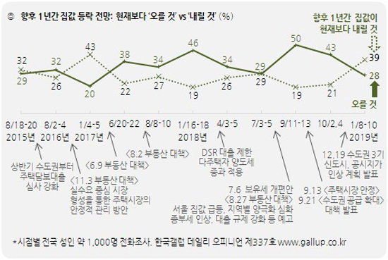 한국갤럽이 2019년 1월 8~10일 전국 성인 1,002명에게 향후 1년간 집값 전망을 물은 결과 28%가 '오를 것'이라고 봤고 39%는 '내릴 것', 23%는 '변화 없을 것'으로 내다봤으며 10%는 의견을 유보했다. 집값 상승 전망은 작년 9.13 주택시장 안정 대책 발표 직전 조사에서 50%, 9.21 수도권 공급 확대 대책 발표 이후인 10월 초 43%, 그리고 이번 조사에서 28%로 감소했다. 집값 하락 전망이 상승 전망을 앞선 것은 2년 만이다. 집값 전망은 2013년부터 2016년까지 상승-하락 모두 30% 안팎을 오르내리다가 2017년 1월 상승 전망 20%로 2013년 이후 최저치, 하락 전망은 43%로 최고치를 기록했다. 당시는 국정농단 사태, 대통령 직무 정지, 탄핵 촉구 촛불집회 등으로 정치·경제적 불확실성이 큰 시기였다. 2019년 현재의 집값 전망 주요 영향 요인은 정부의 부동산 투기 억제 정책이라고 볼 수 있다. 그러나 지난 2년간 부동산 대책 발표 후 일시적 침체기 후 다시 가격 폭등·과열 현상이 재현된 바 있으므로 향후 지속성은 두고볼 일이다.집값이 '오를 것'이란 응답은 전라권 39%, 수도권·충청권·경북권 30% 내외, 경남권 16% 순이다. 작년 정부의 9.13 '주택시장 안정', 9.21 '수도권 공급 확대' 대책, 12.19 수도권 3기 신도시 계획은 모두 서울 집값 급등 현상을 겨냥한 것이었다. 이를 반영하듯 서울시민의 집값 상승 전망이 작년 9월 대책 발표 전후 67%, 10월 48%, 올해 1월 26%로 가장 변화폭이 컸다. 집값 전망을 상승(오를 것)-하락(내릴 것) 격차(Net Score, 순(純) 지수) 기준으로 보면 작년 9월 대책 발표 이후인 10월에도 대부분의 응답자 특성에서 플러스, 즉 오를 것이라는 의견이 우세했다. 그러나 이번 조사에서는 상당수 응답자 특성에서 마이너스, 즉 내릴 것이라는 의견 우세로 반전했다. 작년 9월 전국에서 유일하게 순 지수 마이너스를 기록했던 부산·울산·경남 지역(9월 -3 → 10월 -18 → 10월 -33)은 그 정도가 계속 심화되어, 지역 간 집값 양극화 현상을 짐작케 했다.집값 전망 순 지수는 저연령(20대 26, 30대 -2, 40대 -28, 50대 -26, 60대 이상 -14), 현재 무주택자(3)가 1주택자(-16)나 다주택자(-36)보다 높다. 순 지수를 작년 10월과 비교하면 무주택자(34→3)나 1주택자(16→-16)보다 다주택자(5→-36)의 변화폭이 상대적으로 크다. 즉 다주택자들이 정책에 따른 시장 변화를 더 체감하며, 무주택 젊은 층에게는 이미 오를 대로 오른 집값 자체가 '넘사벽'임을 보여주는 결과로 읽힌다.조사 개요- 조사기간: 2019년 1월 8~10일- 표본추출: 휴대전화 RDD 표본 프레임에서 무작위 추출(집전화 RDD 15% 포함)- 응답방식: 전화조사원 인터뷰- 조사대상: 전국 만 19세 이상 남녀 1,002명- 표본오차: ±3.1%포인트(95% 신뢰수준)- 응답률: 15%(총 통화 6,840명 중 1,002명 응답 완료)- 의뢰처: 한국갤럽 자체 조사