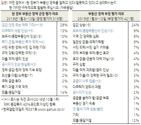 현 정부가 부동산 정책을 잘하고 있는지 물은 결과 32%는 '잘하고 있다', 42%는 '잘못하고 있다'고 답했고 26%가 평가를 유보했다. 작년 10월과 비교하면 긍정 평가는 9%포인트 증가, 부정 평가는 13%포인트 감소했다. 여전히 부정 평가가 앞서지만, 작년 1월부터 10월까지 다섯 차례 조사보다는 호전된 결과다. 재작년 '8·2 대책' 발표 직후 조사에서는 부동산 정책 긍정 평가가 44%였으나, 작년 한 해 내내 30%를 넘지 못했고 9.13 대책 발표 직전에는 16%에 그쳤다.작년 9월 대책 발표 직전과 10월 조사에서는 대부분의 응답자 특성별로 현 정부가 부동산 정책을 잘못하고 있다는 의견이 우세했으나 이번 조사에서는 30·40대, 무주택자 등 일부 응답자 특성에서 긍·부정률 격차가 크지 않은 것으로 나타났다. 부동산 정책 부정 평가는 주택 보유별로 볼 때 다주택자(55%)가 1주택자(44%)와 무주택자(37%)보다, 그리고 집값 전망별로는 상승 전망자(49%)가 하락·보합 전망자(41%·36%)보다 높았다.현 정부 부동산 정책 긍정 평가자에게 그 이유를 물은 결과(316명, 자유응답) '집값 안정 또는 하락 기대'(29%), '다주택자 세금 인상'(13%), '보유세/종합부동산세 인상'(10%), '투기 근절/부동산 투자 억제'(8%), '서민 위한 정책/서민 집 마련 기대'(7%), '규제 강화/강력한 규제'(5%) 등 시장 안정에 대한 기대와 관련 정책 방향 관련 언급이 많았다. 부동산 정책 부정 평가자들은 그 이유로(421명, 자유응답) '집값 상승'(24%), '보유세/종합부동산세 인상', '지역 간 양극화 심화', '일관성 없음/오락가락함'(이상 9%), '서민 피해/서민 살기 어려움'(7%), '규제 부작용 우려/풍선 효과', '효과 없음/근본적 대책 아님', '규제 심함'(이상 4%) 등을 지적했다. 부정 평가 이유에는 여전히 높은 집값 또는 추가 상승에 대한 불안감, 부동산 관련 세금 인상과 대출 규제가 지나치다는 불만과 미흡하다는 지적이 혼재되어 나타났다.조사 개요- 조사기간: 2019년 1월 8~10일- 표본추출: 휴대전화 RDD 표본 프레임에서 무작위 추출(집전화 RDD 15% 포함)- 응답방식: 전화조사원 인터뷰- 조사대상: 전국 만 19세 이상 남녀 1,002명- 표본오차: ±3.1%포인트(95% 신뢰수준)- 응답률: 15%(총 통화 6,840명 중 1,002명 응답 완료)- 의뢰처: 한국갤럽 자체 조사