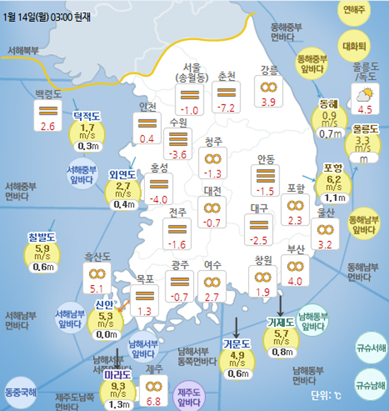 월요일인 1월 14일 오전 5시 20분 현재, 전국이 대체로 맑으나, 경북내륙, 일부 경기내륙과 서해안에는 안개가 짙게 낀 곳이 있는 가운데 오늘 오전까지 남부내륙을 중심으로 짙은 안개와 낮 동안 연무나 박무 곳이 있겠으니 교통안전에 각별히 유의해야 한다.* 주요 지점 가시거리 현황(14일 04시 현재, 단위: m)- 영천 60 운평(화성) 80 영주 130 문경 140 안산 150 봉화 180 상주 200 아산 240 구미 260 능곡(고양) 290오늘은 중국 산둥반도 부근에 위치한 고기압의 영향을 받다가 그 가장자리에 들어 전국이 대체로 맑다가 밤부터 차차 구름많아지겠다.* 예상 강수량(14일 아침까지)- 울릉도.독도: 5mm 미만오늘 미세먼지 농도는 전일에 이어 대기 정체로 국내·외 미세먼지가 축적된 후, 국외 미세먼지가 유입되어 전 권역에서 농도가 높을 것으로 예상된다.서울을 비롯해 경기도, 인천 등 수도권과 강원영서·충청권·광주·전북은 '매우나쁨', 그 밖의 권역은 '나쁨'으로 예상된다. 하지만 그 밖의 권역에서도 '매우나쁨' 수준의 농도가 나타날 수 있다.내일(15일)은 중국 북부지방에서 확장하는 대륙고기압의 영향을 차차 받겠다. 전국이 가끔 구름많다가 오후에 차차 맑아지겠으나, 충남과 전라도, 제주도는 구름많겠다. 경기남부와 충청도에는 낮 동안, 전라서해안과 제주도에는 오후부터 밤 사이에 산발적으로 눈이 날리는 곳이 있겠다.모레(16일)는 중국 중부지방에서 남동진하는 고기압의 영향을 받다가 그 가장자리에 들겠다. 전국이 대체로 맑겠으나, 중부지방은 밤부터 구름이 많아지겠고, 제주도는 가끔 구름많고 새벽에 산지에는 눈이 오는 곳이 있겠다.< 기온 전망 >내일(15일) 아침까지는 따뜻한 서풍이 유입되면서 기온은 평년보다 2~5도 높겠으나, 내륙을 중심으로 아침 기온은 복사냉각으로 떨어지고, 낮 기온은 일사에 의해 오르면서 낮과 밤의 기온차(10~15도)가 크겠으니, 건강관리에 유의해야 한다.내일 낮부터 북서쪽에서 찬 공기가 유입되면서 기온이 떨어지고, 바람도 강하게 불어 체감온도(서울 기준 내일 낮 기온 1도, 체감온도 -5도)는 더욱 낮아 추워지겠다. < 강풍 전망 >내일(15일) 낮부터 북서쪽에서 대륙고기압이 확장함에 따라 해안과 강원산지를 중심으로 바람이 매우 강하게(10~20m/s, 36~72km/h) 불겠고, 내륙에도 강하게(5~10m/s, 18~36km/h) 부는 곳이 있겠으니, 시설물 관리에 유의해야 한다.< 건조 전망 >당분간 고기압의 영향으로 맑은 날씨가 이어지면서 대기가 차차 건조해지겠으니, 산불 등 각종 화재에 각별히 유의해야 한다.< 안개 전망 >오늘 오전까지 남부내륙과 서해안을 중심으로 안개가 짙게 끼는 곳이 있겠고, 낮 동안에도 연무나 박무로 남는 곳이 많겠으니, 건강관리와 교통안전에 각별히 유의해야 한다.< 해상 전망 >내일(15일) 오전에 서해중부먼바다와 동해중부먼바다를 시작으로, 모레(16일)는 대부분 해상에서 바람이 매우 강하게 불고, 물결이 매우 높게 일겠으니, 항해나 조업하는 선박은 각별한 유의가 필요하다. 모레(16일) 동해안에는 너울로 인해 높은 물결이 해안도로나 방파제를 넘는 곳이 있겠으니, 해안가 안전사고에 유의해야 한다. (1) 강풍 예비특보o 01월 15일 오전 : 강원도(강원북부산지, 강원중부산지, 강원남부산지, 태백), 서해5도(2) 풍랑 예비특보o 01월 15일 오전 : 서해중부먼바다, 동해중부먼바다