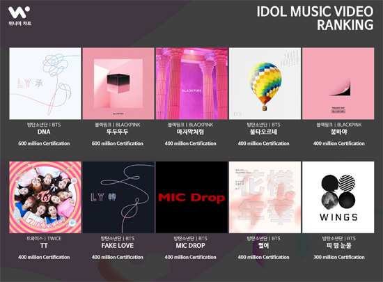 방탄소년단이 2018년에 이어 2019년 새로운 기록을 써내려 가고 있다. 특히 최근 방탄소년단이 뮤직비디오 DNA로 6억뷰를 달성하여 국내외 K-POP 팬들에게 ‘겹경사’를 안겨주었으며, 곧 방탄소년단의 피땀눈물이 4억뷰를 달성하여 국내 4억뷰 아이돌 뮤직비디오가 10건이 넘어설 예정이다.뮤직비디오 순위는 1위 - 방탄소년단 DNA, 2위 - 블랙핑크 뚜두뚜두, 3위 - 블랙핑크 마지막처럼, 4위 - 방탄소년단 불타오르네, 5위 - 블랙핑크 붐바야, 6위 - 트와이스 TT, 7위 - 방탄소년단 FAKE LOVE, 8위 - 방탄소년단 MIC DROP, 9위 - 방탄소년단 쩔어, 10위 - 방탄소년단 피 땀 눈물이 랭크됐다.방탄소년단은 서울 고척스카이돔에서 열린 하이원 서울가요대상 시상식에서 2년 연속 대상과 함께 최고 앨범상과 본상까지 3개 트로피를 품에 안았다. 또한 리패키지 앨범 LOVE YOURSELF 結 ‘Answer’는 ‘빌보드 200’ 78위를 기록하여 지난해 9월 진입 첫 주 1위로 시작해 이번 차트까지 20주 연속 이름을 올렸다.뮤직비디오 DNA, 불타오르네, FAKE LOVE, MIC DROP, 쩔어, 피 땀 눈물, IDOL, SAVE ME, NOT TODAY, 상남자, 봄날, 호르몬전쟁, I NEED U, DANGER, 하루만이 1억뷰를 넘어 총 15개 뮤직비디오로 1억뷰 이상 뮤직비디오 보유 K-POP 아이돌 그룹 1위를 차지했다.한편 방탄소년단은 위니미 차트 트렌드 리더 어워즈 후보에 2연속으로 노미네이트되어 대한민국을 포함하여 미국, 인도네시아, 필리핀, 프랑스, 영국, 일본, 베트남 등 56개국, 6개 언어권에서 투표를 진행한다.